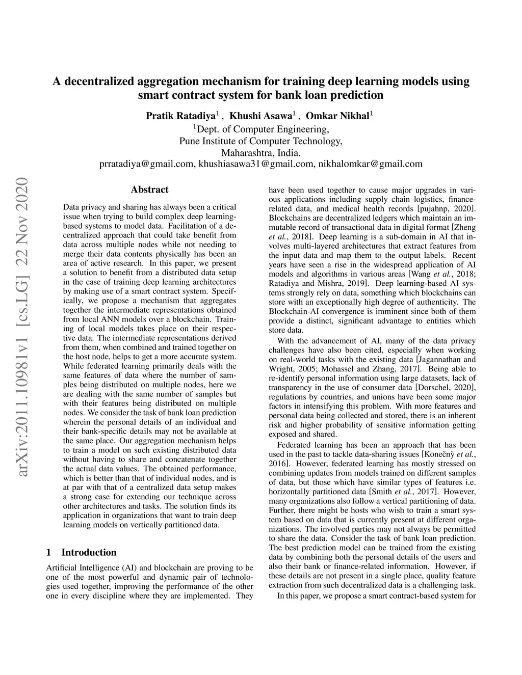 Data privacy and sharing has always been a critical issue when trying to build complex deep learning-based systems to model data. Facilitation of a decentralized approach that could take benefit from data across multiple nodes while not needing to merge their data contents physically has been an area of active research. In this paper, we present a solution to benefit from a distributed data setup in the case of training deep learning architectures by making use of a smart contract system. Specifically, we propose a mechanism that aggregates together the intermediate representations obtained from local ANN models over a blockchain. Training of local models takes place on their respective data. The intermediate representations derived from them, when combined and trained together on the host node, helps to get a more accurate system. While federated learning primarily deals with the same features of data where the number of samples being distributed on multiple nodes, here we are dealing with the same number of samples but with their features being distributed on multiple nodes. We consider the task of bank loan prediction wherein the personal details of an individual and their bank-specific details may not be available at the same place. Our aggregation mechanism helps to train a model on such existing distributed data without having to share and concatenate together the actual data values. The obtained performance, which is better than that of individual nodes, and is at par with that of a centralized data setup makes a strong case for extending our technique across other architectures and tasks. The solution finds its application in organizations that want to train deep learning models on vertically partitioned data.