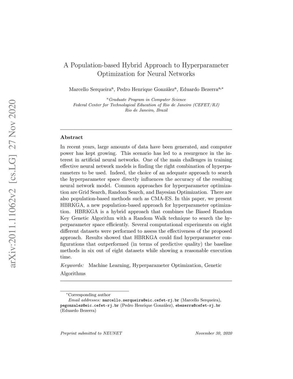 In recent years, large amounts of data have been generated, and computer power has kept growing. This scenario has led to a resurgence in the interest in artificial neural networks. One of the main challenges in training effective neural network models is finding the right combination of hyperparameters to be used. Indeed, the choice of an adequate approach to search the hyperparameter space directly influences the accuracy of the resulting neural network model. Common approaches for hyperparameter optimization are Grid Search, Random Search, and Bayesian Optimization. There are also population-based methods such as CMA-ES. In this paper, we present HBRKGA, a new population-based approach for hyperparameter optimization. HBRKGA is a hybrid approach that combines the Biased Random Key Genetic Algorithm with a Random Walk technique to search the hyperparameter space efficiently. Several computational experiments on eight different datasets were performed to assess the effectiveness of the proposed approach. Results showed that HBRKGA could find hyperparameter configurations that outperformed (in terms of predictive quality) the baseline methods in six out of eight datasets while showing a reasonable execution time.
