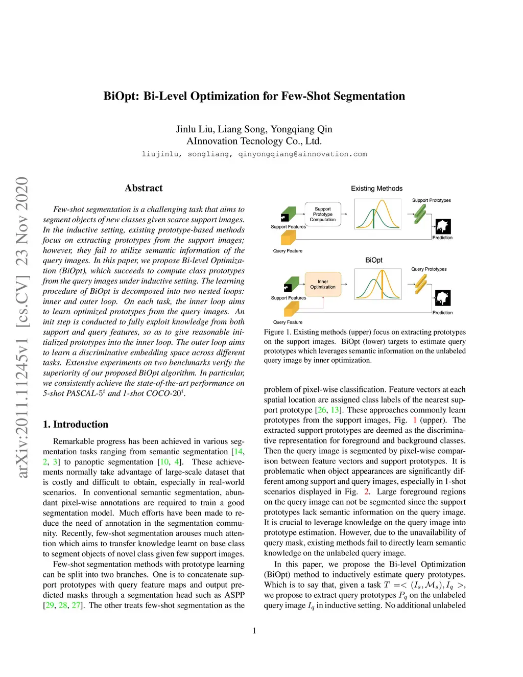 Few-shot segmentation is a challenging task that aims to segment objects of new classes given scarce support images. In the inductive setting, existing prototype-based methods focus on extracting prototypes from the support images; however, they fail to utilize semantic information of the query images. In this paper, we propose Bi-level Optimization (BiOpt), which succeeds to compute class prototypes from the query images under inductive setting. The learning procedure of BiOpt is decomposed into two nested loops: inner and outer loop. On each task, the inner loop aims to learn optimized prototypes from the query images. An init step is conducted to fully exploit knowledge from both support and query features, so as to give reasonable initialized prototypes into the inner loop. The outer loop aims to learn a discriminative embedding space across different tasks. Extensive experiments on two benchmarks verify the superiority of our proposed BiOpt algorithm. In particular, we consistently achieve the state-of-the-art performance on 5-shot PASCAL- and 1-shot COCO-.