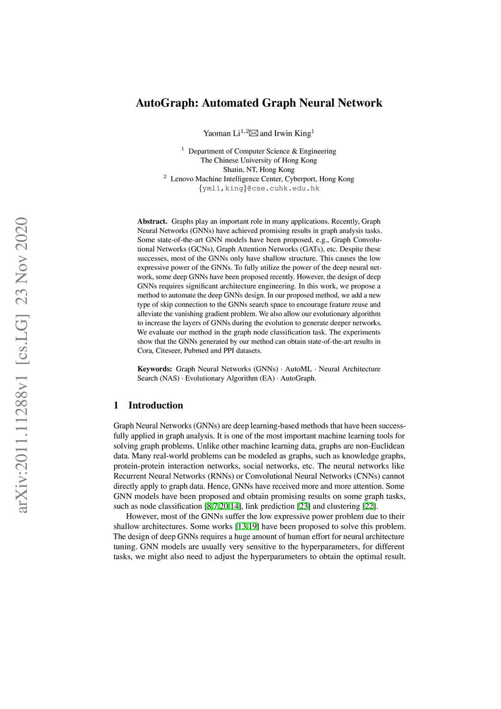 Graphs play an important role in many applications. Recently, Graph Neural Networks (GNNs) have achieved promising results in graph analysis tasks. Some state-of-the-art GNN models have been proposed, e.g., Graph Convolutional Networks (GCNs), Graph Attention Networks (GATs), etc. Despite these successes, most of the GNNs only have shallow structure. This causes the low expressive power of the GNNs. To fully utilize the power of the deep neural network, some deep GNNs have been proposed recently. However, the design of deep GNNs requires significant architecture engineering. In this work, we propose a method to automate the deep GNNs design. In our proposed method, we add a new type of skip connection to the GNNs search space to encourage feature reuse and alleviate the vanishing gradient problem. We also allow our evolutionary algorithm to increase the layers of GNNs during the evolution to generate deeper networks. We evaluate our method in the graph node classification task. The experiments show that the GNNs generated by our method can obtain state-of-the-art results in Cora, Citeseer, Pubmed and PPI datasets.