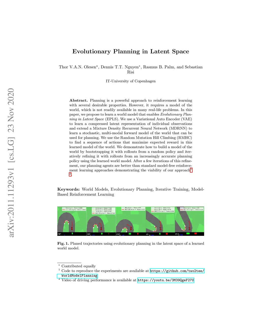 Planning is a powerful approach to reinforcement learning with several desirable properties. However, it requires a model of the world, which is not readily available in many real-life problems. In this paper, we propose to learn a world model that enables Evolutionary Planning in Latent Space (EPLS). We use a Variational Auto Encoder (VAE) to learn a compressed latent representation of individual observations and extend a Mixture Density Recurrent Neural Network (MDRNN) to learn a stochastic, multi-modal forward model of the world that can be used for planning. We use the Random Mutation Hill Climbing (RMHC) to find a sequence of actions that maximize expected reward in this learned model of the world. We demonstrate how to build a model of the world by bootstrapping it with rollouts from a random policy and iteratively refining it with rollouts from an increasingly accurate planning policy using the learned world model. After a few iterations of this refinement, our planning agents are better than standard model-free reinforcement learning approaches demonstrating the viability of our approach.