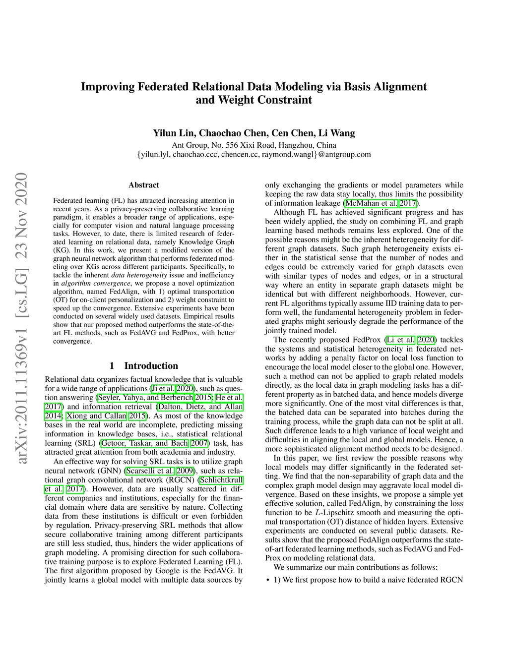 Federated learning (FL) has attracted increasing attention in recent years. As a privacy-preserving collaborative learning paradigm, it enables a broader range of applications, especially for computer vision and natural language processing tasks. However, to date, there is limited research of federated learning on relational data, namely Knowledge Graph (KG). In this work, we present a modified version of the graph neural network algorithm that performs federated modeling over KGs across different participants. Specifically, to tackle the inherent data heterogeneity issue and inefficiency in algorithm convergence, we propose a novel optimization algorithm, named FedAlign, with 1) optimal transportation (OT) for on-client personalization and 2) weight constraint to speed up the convergence. Extensive experiments have been conducted on several widely used datasets. Empirical results show that our proposed method outperforms the state-of-the-art FL methods, such as FedAVG and FedProx, with better convergence.