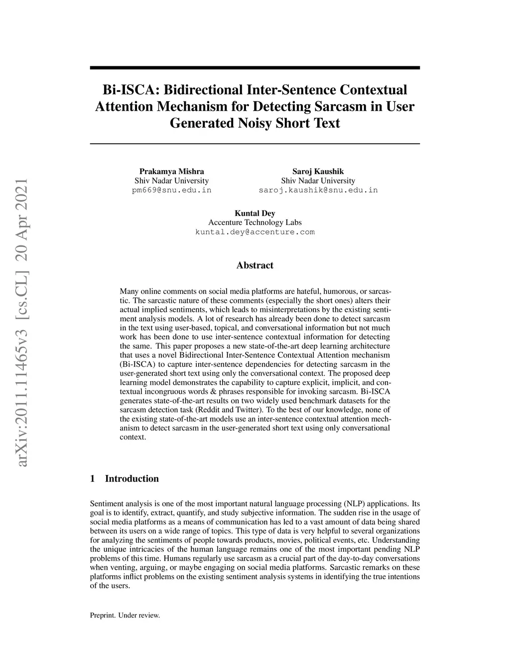 Many online comments on social media platforms are hateful, humorous, or sarcastic. The sarcastic nature of these comments (especially the short ones) alters their actual implied sentiments, which leads to misinterpretations by the existing sentiment analysis models. A lot of research has already been done to detect sarcasm in the text using user-based, topical, and conversational information but not much work has been done to use inter-sentence contextual information for detecting the same. This paper proposes a new state-of-the-art deep learning architecture that uses a novel Bidirectional Inter-Sentence Contextual Attention mechanism (Bi-ISCA) to capture inter-sentence dependencies for detecting sarcasm in the user-generated short text using only the conversational context. The proposed deep learning model demonstrates the capability to capture explicit, implicit, and contextual incongruous words & phrases responsible for invoking sarcasm. Bi-ISCA generates state-of-the-art results on two widely used benchmark datasets for the sarcasm detection task (Reddit and Twitter). To the best of our knowledge, none of the existing state-of-the-art models use an inter-sentence contextual attention mechanism to detect sarcasm in the user-generated short text using only conversational context.
