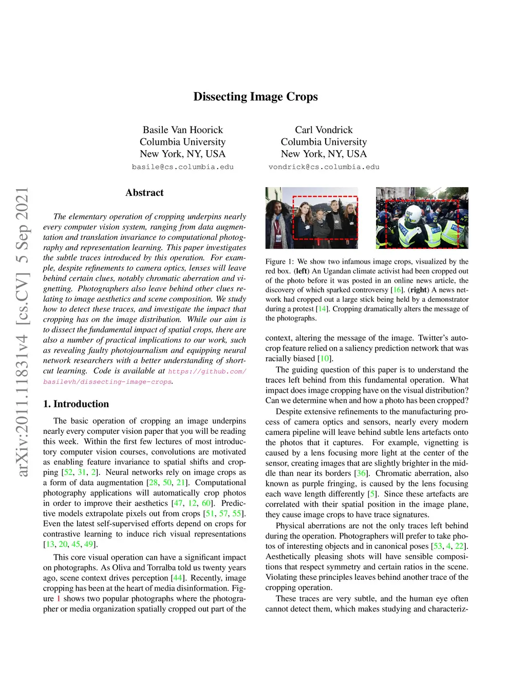 The elementary operation of cropping underpins nearly every computer vision system, ranging from data augmentation and translation invariance to computational photography and representation learning. This paper investigates the subtle traces introduced by this operation. For example, despite refinements to camera optics, lenses will leave behind certain clues, notably chromatic aberration and vignetting. Photographers also leave behind other clues relating to image aesthetics and scene composition. We study how to detect these traces, and investigate the impact that cropping has on the image distribution. While our aim is to dissect the fundamental impact of spatial crops, there are also a number of practical implications to our work, such as revealing faulty photojournalism and equipping neural network researchers with a better understanding of shortcut learning. Code is available at https://github.com/basilevh/dissecting-image-crops.
