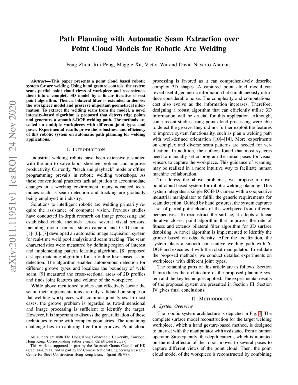 This paper presents a point cloud based robotic system for arc welding. Using hand gesture controls, the system scans partial point cloud views of workpiece and reconstructs them into a complete 3D model by a linear iterative closest point algorithm. Then, a bilateral filter is extended to denoise the workpiece model and preserve important geometrical information. To extract the welding seam from the model, a novel intensity-based algorithm is proposed that detects edge points and generates a smooth 6-DOF welding path. The methods are tested on multiple workpieces with different joint types and poses. Experimental results prove the robustness and efficiency of this robotic system on automatic path planning for welding applications.