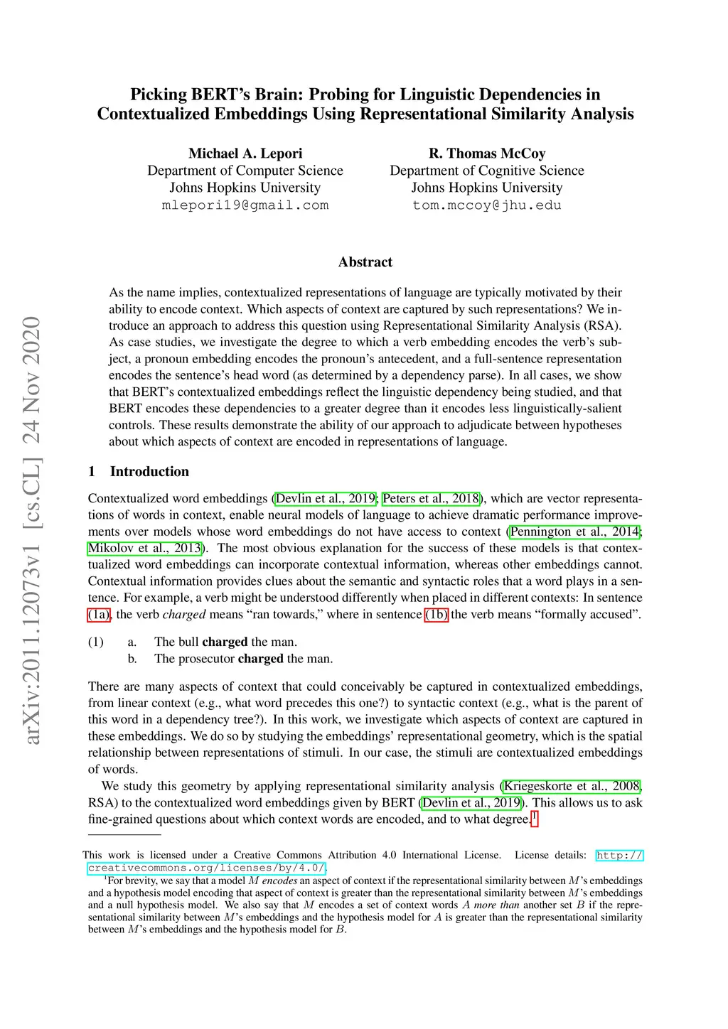 As the name implies, contextualized representations of language are typically motivated by their ability to encode context. Which aspects of context are captured by such representations? We introduce an approach to address this question using Representational Similarity Analysis (RSA). As case studies, we investigate the degree to which a verb embedding encodes the verb's subject, a pronoun embedding encodes the pronoun's antecedent, and a full-sentence representation encodes the sentence's head word (as determined by a dependency parse). In all cases, we show that BERT's contextualized embeddings reflect the linguistic dependency being studied, and that BERT encodes these dependencies to a greater degree than it encodes less linguistically-salient controls. These results demonstrate the ability of our approach to adjudicate between hypotheses about which aspects of context are encoded in representations of language.