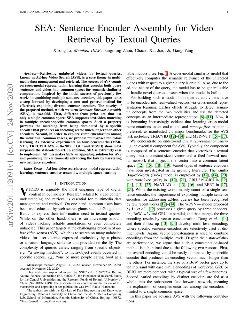 SEA: Sentence Encoder Assembly for Video Retrieval by Textual Queries