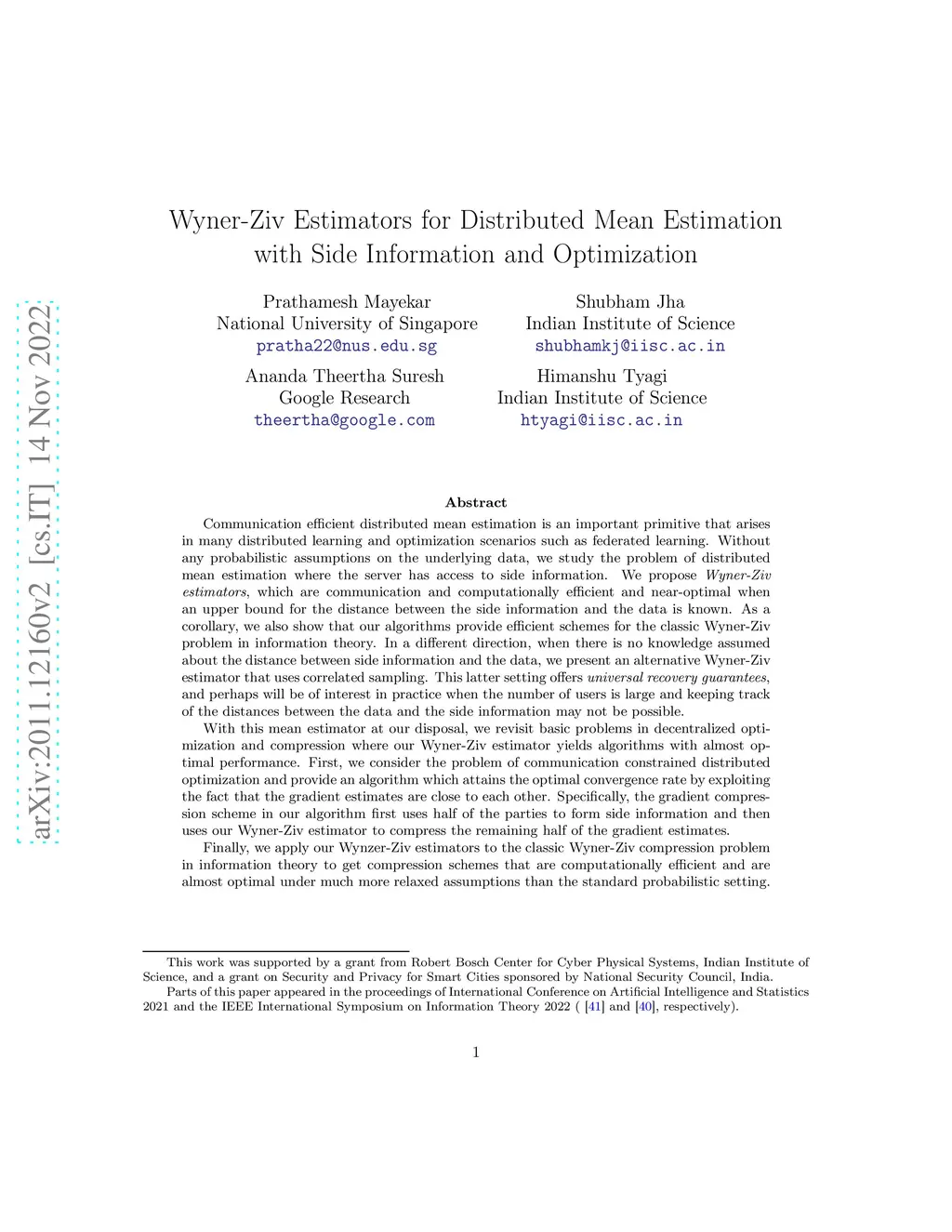 Communication efficient distributed mean estimation is an important primitive that arises in many distributed learning and optimization scenarios such as federated learning. Without any probabilistic assumptions on the underlying data, we study the problem of distributed mean estimation where the server has access to side information. We propose \emph{Wyner-Ziv estimators}, which are communication and computationally efficient and near-optimal when an upper bound for the distance between the side information and the data is known. As a corollary, we also show that our algorithms provide efficient schemes for the classic Wyner-Ziv problem in information theory. In a different direction, when there is no knowledge assumed about the distance between side information and the data, we present an alternative Wyner-Ziv estimator that uses correlated sampling. This latter setting offers {\em universal recovery guarantees}, and perhaps will be of interest in practice when the number of users is large and keeping track of the distances between the data and the side information may not be possible. With this mean estimator at our disposal, we revisit basic problems in decentralized optimization and compression where our Wyner-Ziv estimator yields algorithms with almost optimal performance. First, we consider the problem of communication constrained distributed optimization and provide an algorithm which attains the optimal convergence rate by exploiting the fact that the gradient estimates are close to each other. Specifically, the gradient compression scheme in our algorithm first uses half of the parties to form side information and then uses our Wyner-Ziv estimator to compress the remaining half of the gradient estimates.