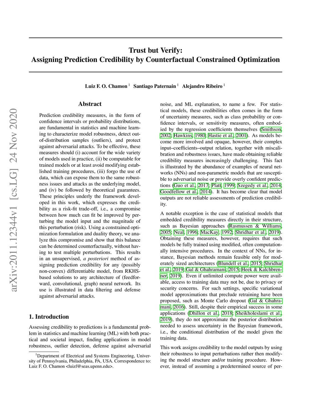 Prediction credibility measures, in the form of confidence intervals or probability distributions, are fundamental in statistics and machine learning to characterize model robustness, detect out-of-distribution samples (outliers), and protect against adversarial attacks. To be effective, these measures should (i) account for the wide variety of models used in practice, (ii) be computable for trained models or at least avoid modifying established training procedures, (iii) forgo the use of data, which can expose them to the same robustness issues and attacks as the underlying model, and (iv) be followed by theoretical guarantees. These principles underly the framework developed in this work, which expresses the credibility as a risk-fit trade-off, i.e., a compromise between how much can fit be improved by perturbing the model input and the magnitude of this perturbation (risk). Using a constrained optimization formulation and duality theory, we analyze this compromise and show that this balance can be determined counterfactually, without having to test multiple perturbations. This results in an unsupervised, a posteriori method of assigning prediction credibility for any (possibly non-convex) differentiable model, from RKHS-based solutions to any architecture of (feedforward, convolutional, graph) neural network. Its use is illustrated in data filtering and defense against adversarial attacks.