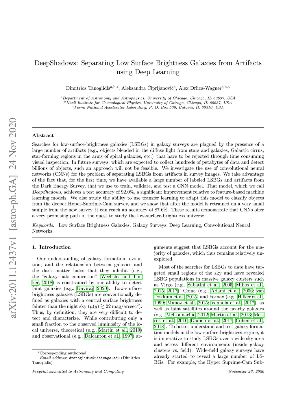Searches for low-surface-brightness galaxies (LSBGs) in galaxy surveys are plagued by the presence of a large number of artifacts (e.g., objects blended in the diffuse light from stars and galaxies, Galactic cirrus, star-forming regions in the arms of spiral galaxies, etc.) that have to be rejected through time consuming visual inspection. In future surveys, which are expected to collect hundreds of petabytes of data and detect billions of objects, such an approach will not be feasible. We investigate the use of convolutional neural networks (CNNs) for the problem of separating LSBGs from artifacts in survey images. We take advantage of the fact that, for the first time, we have available a large number of labeled LSBGs and artifacts from the Dark Energy Survey, that we use to train, validate, and test a CNN model. That model, which we call DeepShadows, achieves a test accuracy of , a significant improvement relative to feature-based machine learning models. We also study the ability to use transfer learning to adapt this model to classify objects from the deeper Hyper-Suprime-Cam survey, and we show that after the model is retrained on a very small sample from the new survey, it can reach an accuracy of . These results demonstrate that CNNs offer a very promising path in the quest to study the low-surface-brightness universe.