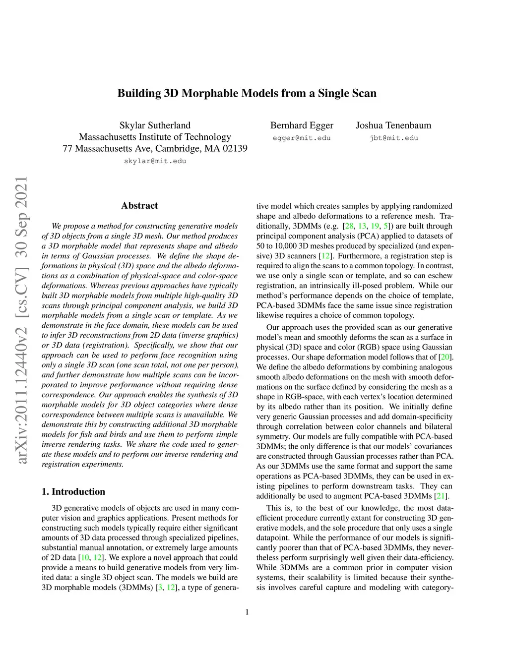 We propose a method for constructing generative models of 3D objects from a single 3D mesh. Our method produces a 3D morphable model that represents shape and albedo in terms of Gaussian processes. We define the shape deformations in physical (3D) space and the albedo deformations as a combination of physical-space and color-space deformations. Whereas previous approaches have typically built 3D morphable models from multiple high-quality 3D scans through principal component analysis, we build 3D morphable models from a single scan or template. As we demonstrate in the face domain, these models can be used to infer 3D reconstructions from 2D data (inverse graphics) or 3D data (registration). Specifically, we show that our approach can be used to perform face recognition using only a single 3D scan (one scan total, not one per person), and further demonstrate how multiple scans can be incorporated to improve performance without requiring dense correspondence. Our approach enables the synthesis of 3D morphable models for 3D object categories where dense correspondence between multiple scans is unavailable. We demonstrate this by constructing additional 3D morphable models for fish and birds and use them to perform simple inverse rendering tasks. We share the code used to generate these models and to perform our inverse rendering and registration experiments.