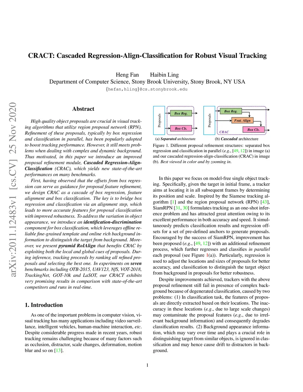 High quality object proposals are crucial in visual tracking algorithms that utilize region proposal network (RPN). Refinement of these proposals, typically by box regression and classification in parallel, has been popularly adopted to boost tracking performance. However, it still meets problems when dealing with complex and dynamic background. Thus motivated, in this paper we introduce an improved proposal refinement module, Cascaded Regression-Align-Classification (CRAC), which yields new state-of-the-art performances on many benchmarks. First, having observed that the offsets from box regression can serve as guidance for proposal feature refinement, we design CRAC as a cascade of box regression, feature alignment and box classification. The key is to bridge box regression and classification via an alignment step, which leads to more accurate features for proposal classification with improved robustness. To address the variation in object appearance, we introduce an identification-discrimination component for box classification, which leverages offline reliable fine-grained template and online rich background information to distinguish the target from background. Moreover, we present pyramid RoIAlign that benefits CRAC by exploiting both the local and global cues of proposals. During inference, tracking proceeds by ranking all refined proposals and selecting the best one. In experiments on seven benchmarks including OTB-2015, UAV123, NfS, VOT-2018, TrackingNet, GOT-10k and LaSOT, our CRACT exhibits very promising results in comparison with state-of-the-art competitors and runs in real-time.
