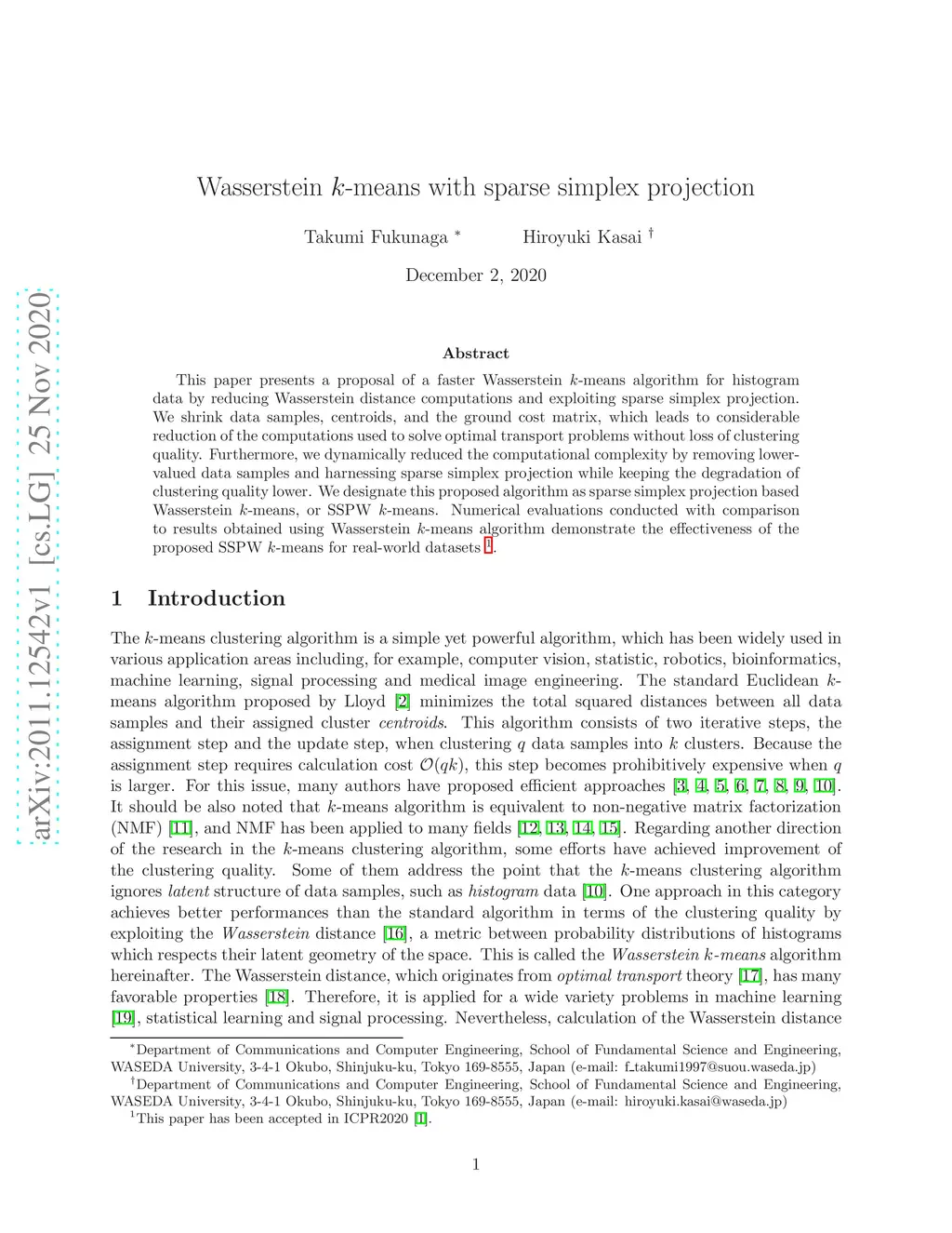This paper presents a proposal of a faster Wasserstein -means algorithm for histogram data by reducing Wasserstein distance computations and exploiting sparse simplex projection. We shrink data samples, centroids, and the ground cost matrix, which leads to considerable reduction of the computations used to solve optimal transport problems without loss of clustering quality. Furthermore, we dynamically reduced the computational complexity by removing lower-valued data samples and harnessing sparse simplex projection while keeping the degradation of clustering quality lower. We designate this proposed algorithm as sparse simplex projection based Wasserstein -means, or SSPW -means. Numerical evaluations conducted with comparison to results obtained using Wasserstein -means algorithm demonstrate the effectiveness of the proposed SSPW -means for real-world datasets