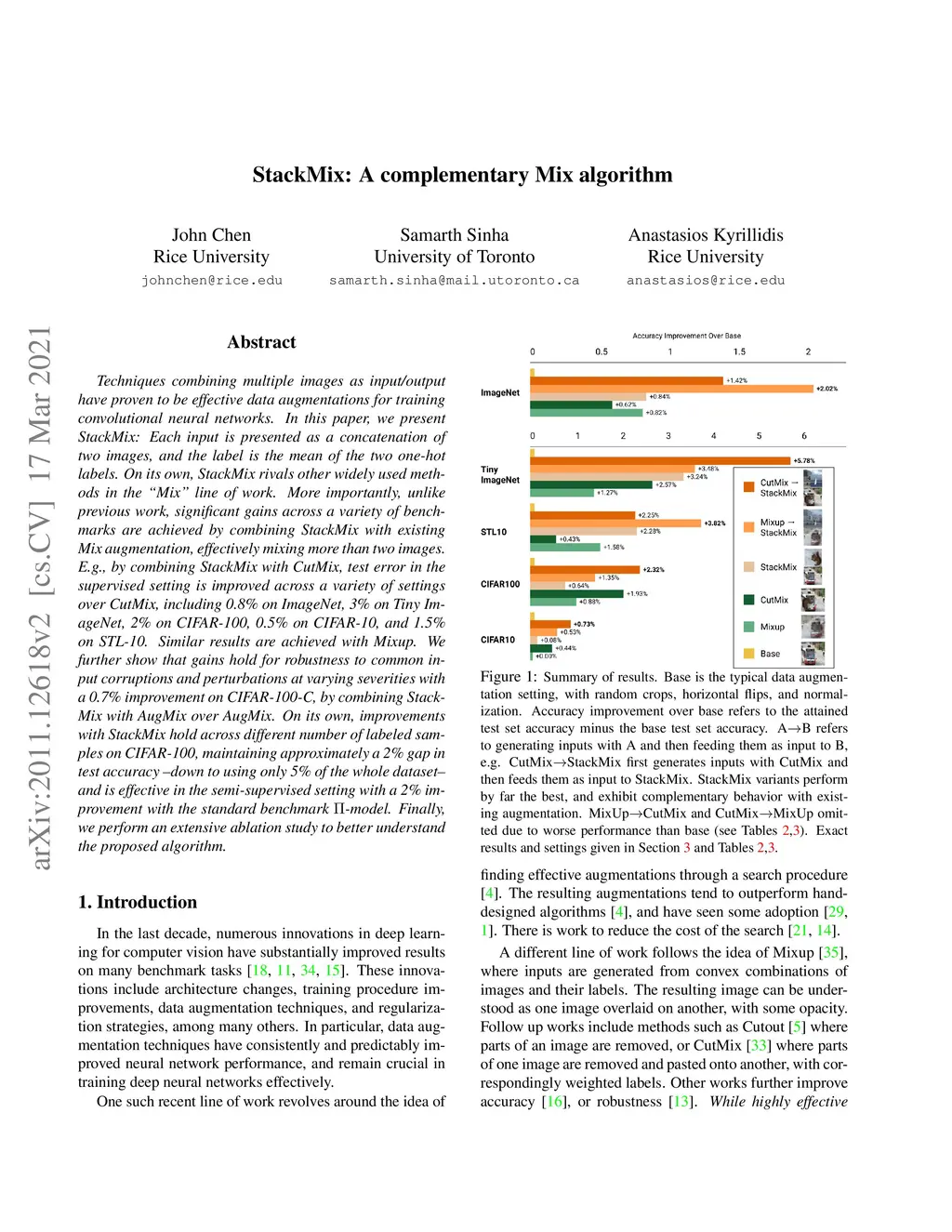 Techniques combining multiple images as input/output have proven to be effective data augmentations for training convolutional neural networks. In this paper, we present StackMix: Each input is presented as a concatenation of two images, and the label is the mean of the two one-hot labels. On its own, StackMix rivals other widely used methods in the "Mix" line of work. More importantly, unlike previous work, significant gains across a variety of benchmarks are achieved by combining StackMix with existing Mix augmentation, effectively mixing more than two images. E.g., by combining StackMix with CutMix, test error in the supervised setting is improved across a variety of settings over CutMix, including 0.8\% on ImageNet, 3\% on Tiny ImageNet, 2\% on CIFAR-100, 0.5\% on CIFAR-10, and 1.5\% on STL-10. Similar results are achieved with Mixup.We further show that gains hold for robustness to common input corruptions and perturbations at varying severities with a 0.7\% improvement on CIFAR-100-C, by combining StackMix with AugMix over AugMix. On its own, improvements with StackMix hold across different number of labeled samples on CIFAR-100, maintaining approximately a 2\% gap in test accuracy -- down to using only 5\% of the whole dataset -- and is effective in the semi-supervised setting with a 2\% improvement with the standard benchmark -model. Finally, we perform an extensive ablation study to better understand the proposed algorithm.