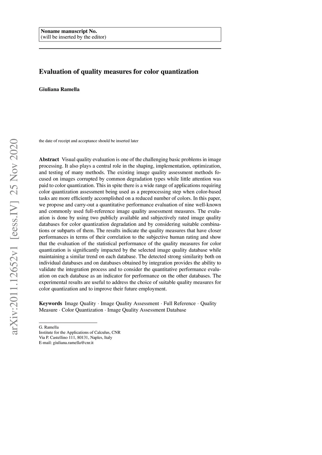 Visual quality evaluation is one of the challenging basic problems in image processing. It also plays a central role in the shaping, implementation, optimization, and testing of many methods. The existing image quality assessment methods focused on images corrupted by common degradation types while little attention was paid to color quantization. This in spite there is a wide range of applications requiring color quantization assessment being used as a preprocessing step when color-based tasks are more efficiently accomplished on a reduced number of colors. In this paper, we propose and carry-out a quantitative performance evaluation of nine well-known and commonly used full-reference image quality assessment measures. The evaluation is done by using two publicly available and subjectively rated image quality databases for color quantization degradation and by considering suitable combinations or subparts of them. The results indicate the quality measures that have closer performances in terms of their correlation to the subjective human rating and show that the evaluation of the statistical performance of the quality measures for color quantization is significantly impacted by the selected image quality database while maintaining a similar trend on each database. The detected strong similarity both on individual databases and on databases obtained by integration provides the ability to validate the integration process and to consider the quantitative performance evaluation on each database as an indicator for performance on the other databases. The experimental results are useful to address the choice of suitable quality measures for color quantization and to improve their future employment.