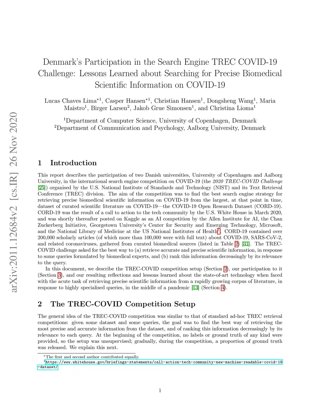 This report describes the participation of two Danish universities, University of Copenhagen and Aalborg University, in the international search engine competition on COVID-19 (the 2020 TREC-COVID Challenge) organised by the U.S. National Institute of Standards and Technology (NIST) and its Text Retrieval Conference (TREC) division. The aim of the competition was to find the best search engine strategy for retrieving precise biomedical scientific information on COVID-19 from the largest, at that point in time, dataset of curated scientific literature on COVID-19 -- the COVID-19 Open Research Dataset (CORD-19). CORD-19 was the result of a call to action to the tech community by the U.S. White House in March 2020, and was shortly thereafter posted on Kaggle as an AI competition by the Allen Institute for AI, the Chan Zuckerberg Initiative, Georgetown University's Center for Security and Emerging Technology, Microsoft, and the National Library of Medicine at the US National Institutes of Health. CORD-19 contained over 200,000 scholarly articles (of which more than 100,000 were with full text) about COVID-19, SARS-CoV-2, and related coronaviruses, gathered from curated biomedical sources. The TREC-COVID challenge asked for the best way to (a) retrieve accurate and precise scientific information, in response to some queries formulated by biomedical experts, and (b) rank this information decreasingly by its relevance to the query. In this document, we describe the TREC-COVID competition setup, our participation to it, and our resulting reflections and lessons learned about the state-of-art technology when faced with the acute task of retrieving precise scientific information from a rapidly growing corpus of literature, in response to highly specialised queries, in the middle of a pandemic.