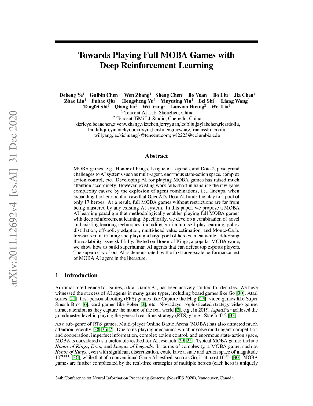 MOBA games, e.g., Honor of Kings, League of Legends, and Dota 2, pose grand challenges to AI systems such as multi-agent, enormous state-action space, complex action control, etc. Developing AI for playing MOBA games has raised much attention accordingly. However, existing work falls short in handling the raw game complexity caused by the explosion of agent combinations, i.e., lineups, when expanding the hero pool in case that OpenAI's Dota AI limits the play to a pool of only 17 heroes. As a result, full MOBA games without restrictions are far from being mastered by any existing AI system. In this paper, we propose a MOBA AI learning paradigm that methodologically enables playing full MOBA games with deep reinforcement learning. Specifically, we develop a combination of novel and existing learning techniques, including curriculum self-play learning, policy distillation, off-policy adaption, multi-head value estimation, and Monte-Carlo tree-search, in training and playing a large pool of heroes, meanwhile addressing the scalability issue skillfully. Tested on Honor of Kings, a popular MOBA game, we show how to build superhuman AI agents that can defeat top esports players. The superiority of our AI is demonstrated by the first large-scale performance test of MOBA AI agent in the literature.