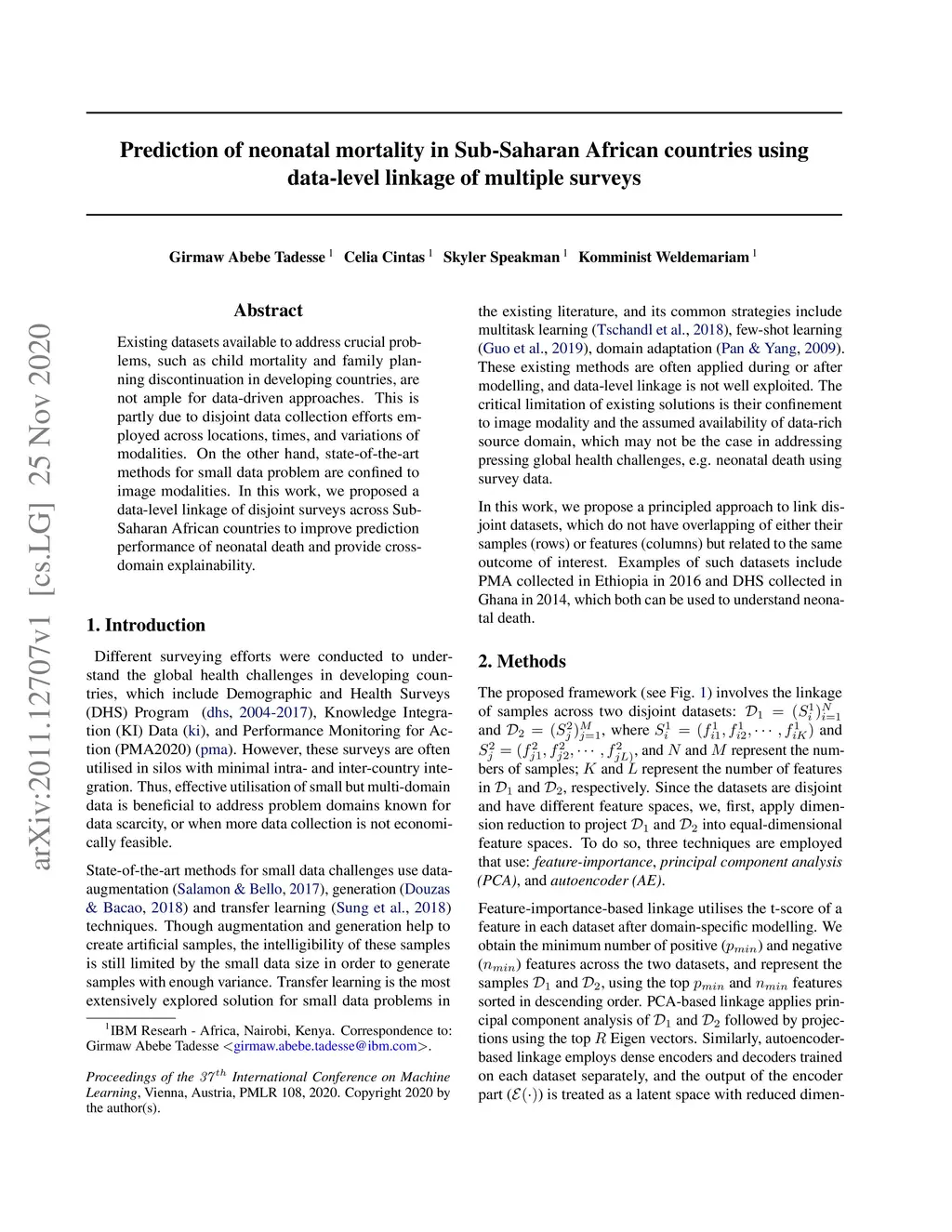 Existing datasets available to address crucial problems, such as child mortality and family planning discontinuation in developing countries, are not ample for data-driven approaches. This is partly due to disjoint data collection efforts employed across locations, times, and variations of modalities. On the other hand, state-of-the-art methods for small data problem are confined to image modalities. In this work, we proposed a data-level linkage of disjoint surveys across Sub-Saharan African countries to improve prediction performance of neonatal death and provide cross-domain explainability.