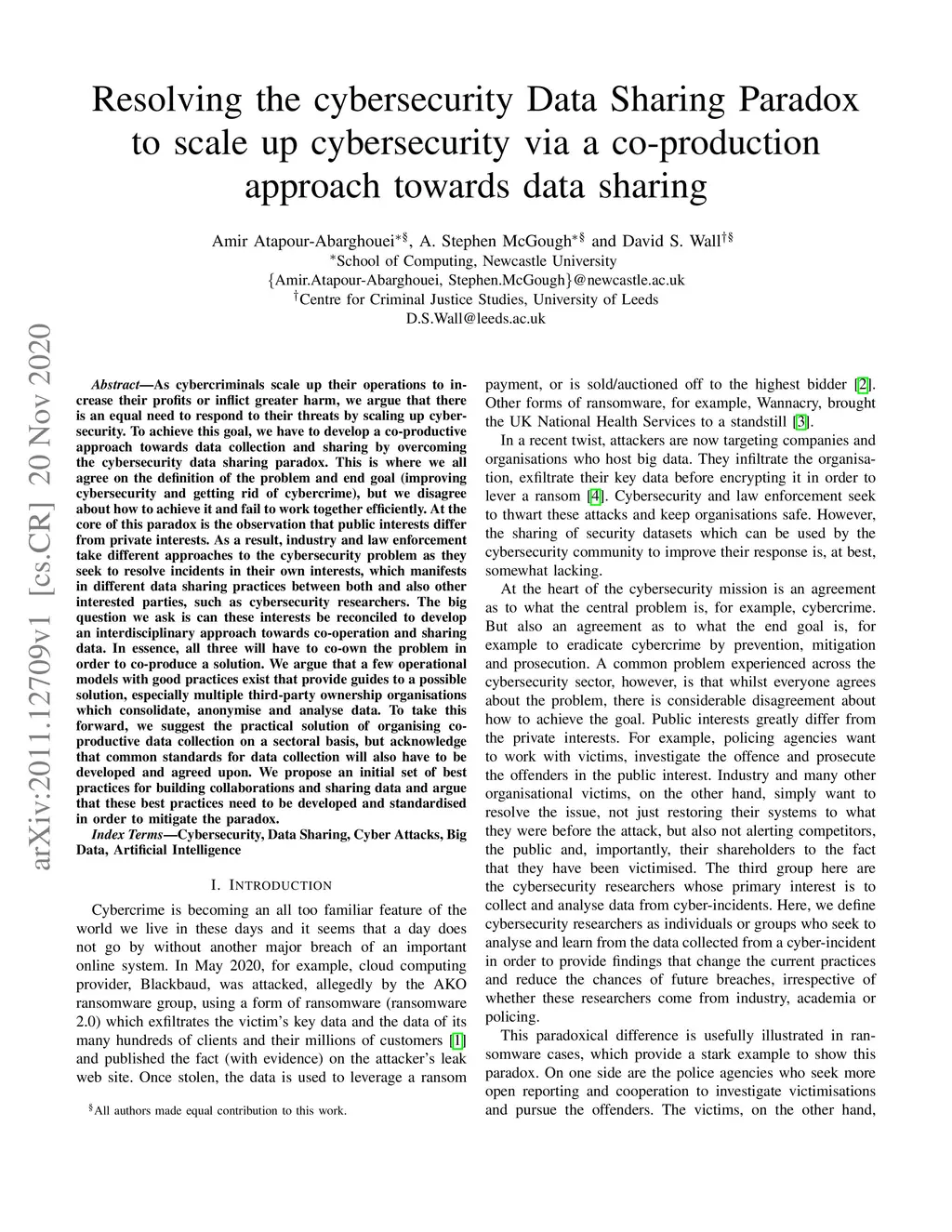 As cybercriminals scale up their operations to increase their profits or inflict greater harm, we argue that there is an equal need to respond to their threats by scaling up cybersecurity. To achieve this goal, we have to develop a co-productive approach towards data collection and sharing by overcoming the cybersecurity data sharing paradox. This is where we all agree on the definition of the problem and end goal (improving cybersecurity and getting rid of cybercrime), but we disagree about how to achieve it and fail to work together efficiently. At the core of this paradox is the observation that public interests differ from private interests. As a result, industry and law enforcement take different approaches to the cybersecurity problem as they seek to resolve incidents in their own interests, which manifests in different data sharing practices between both and also other interested parties, such as cybersecurity researchers. The big question we ask is can these interests be reconciled to develop an interdisciplinary approach towards co-operation and sharing data. In essence, all three will have to co-own the problem in order to co-produce a solution. We argue that a few operational models with good practices exist that provide guides to a possible solution, especially multiple third-party ownership organisations which consolidate, anonymise and analyse data. To take this forward, we suggest the practical solution of organising co-productive data collection on a sectoral basis, but acknowledge that common standards for data collection will also have to be developed and agreed upon. We propose an initial set of best practices for building collaborations and sharing data and argue that these best practices need to be developed and standardised in order to mitigate the paradox.