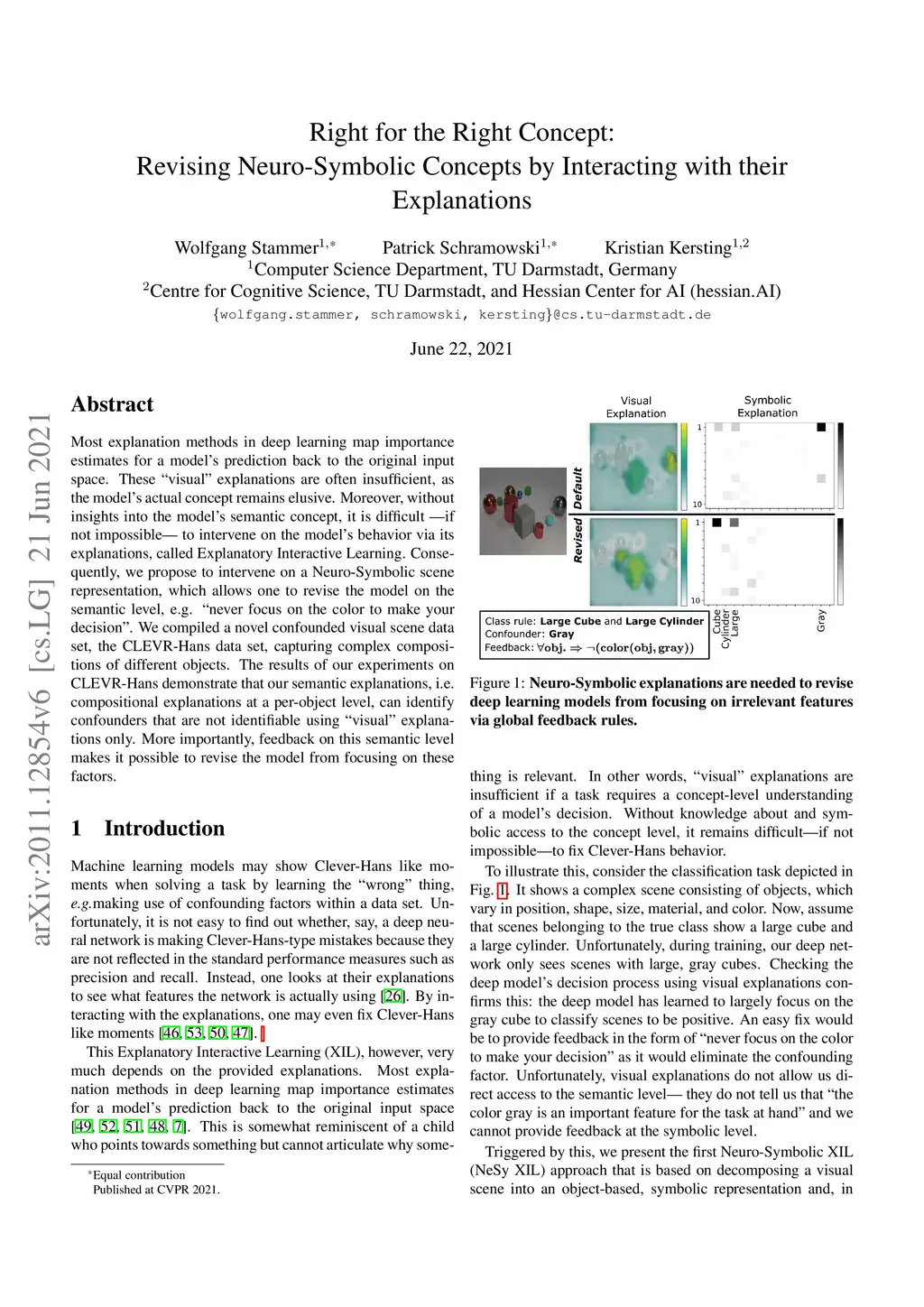 Most explanation methods in deep learning map importance estimates for a model's prediction back to the original input space. These "visual" explanations are often insufficient, as the model's actual concept remains elusive. Moreover, without insights into the model's semantic concept, it is difficult -- if not impossible -- to intervene on the model's behavior via its explanations, called Explanatory Interactive Learning. Consequently, we propose to intervene on a Neuro-Symbolic scene representation, which allows one to revise the model on the semantic level, e.g. "never focus on the color to make your decision". We compiled a novel confounded visual scene data set, the CLEVR-Hans data set, capturing complex compositions of different objects. The results of our experiments on CLEVR-Hans demonstrate that our semantic explanations, i.e. compositional explanations at a per-object level, can identify confounders that are not identifiable using "visual" explanations only. More importantly, feedback on this semantic level makes it possible to revise the model from focusing on these factors.