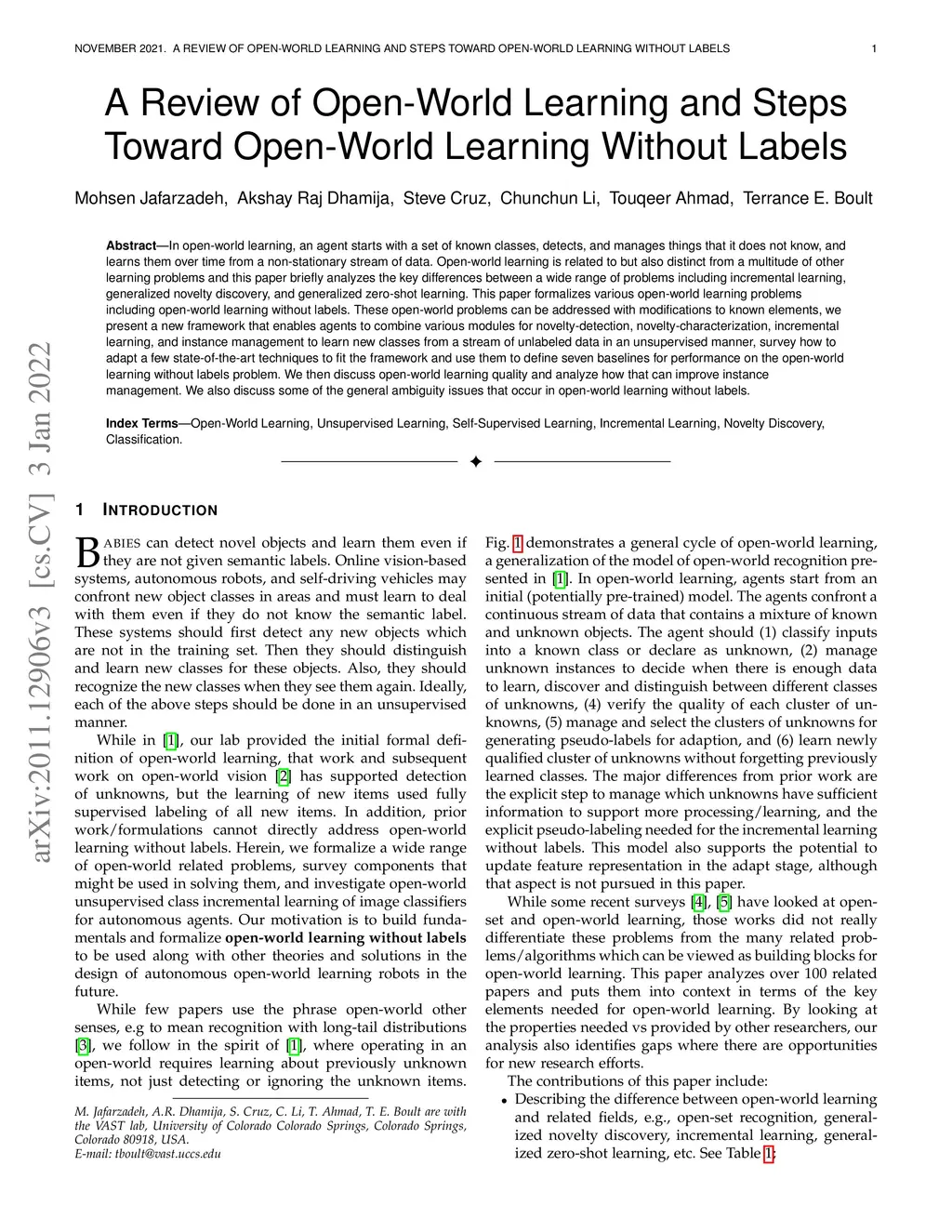 In open-world learning, an agent starts with a set of known classes, detects, and manages things that it does not know, and learns them over time from a non-stationary stream of data. Open-world learning is related to but also distinct from a multitude of other learning problems and this paper briefly analyzes the key differences between a wide range of problems including incremental learning, generalized novelty discovery, and generalized zero-shot learning. This paper formalizes various open-world learning problems including open-world learning without labels. These open-world problems can be addressed with modifications to known elements, we present a new framework that enables agents to combine various modules for novelty-detection, novelty-characterization, incremental learning, and instance management to learn new classes from a stream of unlabeled data in an unsupervised manner, survey how to adapt a few state-of-the-art techniques to fit the framework and use them to define seven baselines for performance on the open-world learning without labels problem. We then discuss open-world learning quality and analyze how that can improve instance management. We also discuss some of the general ambiguity issues that occur in open-world learning without labels.