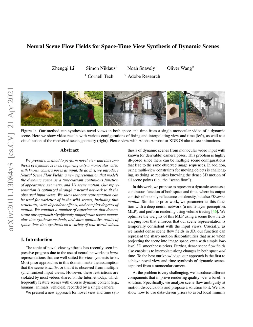 Neural Scene Flow Fields for Space-Time View Synthesis of Dynamic Scenes