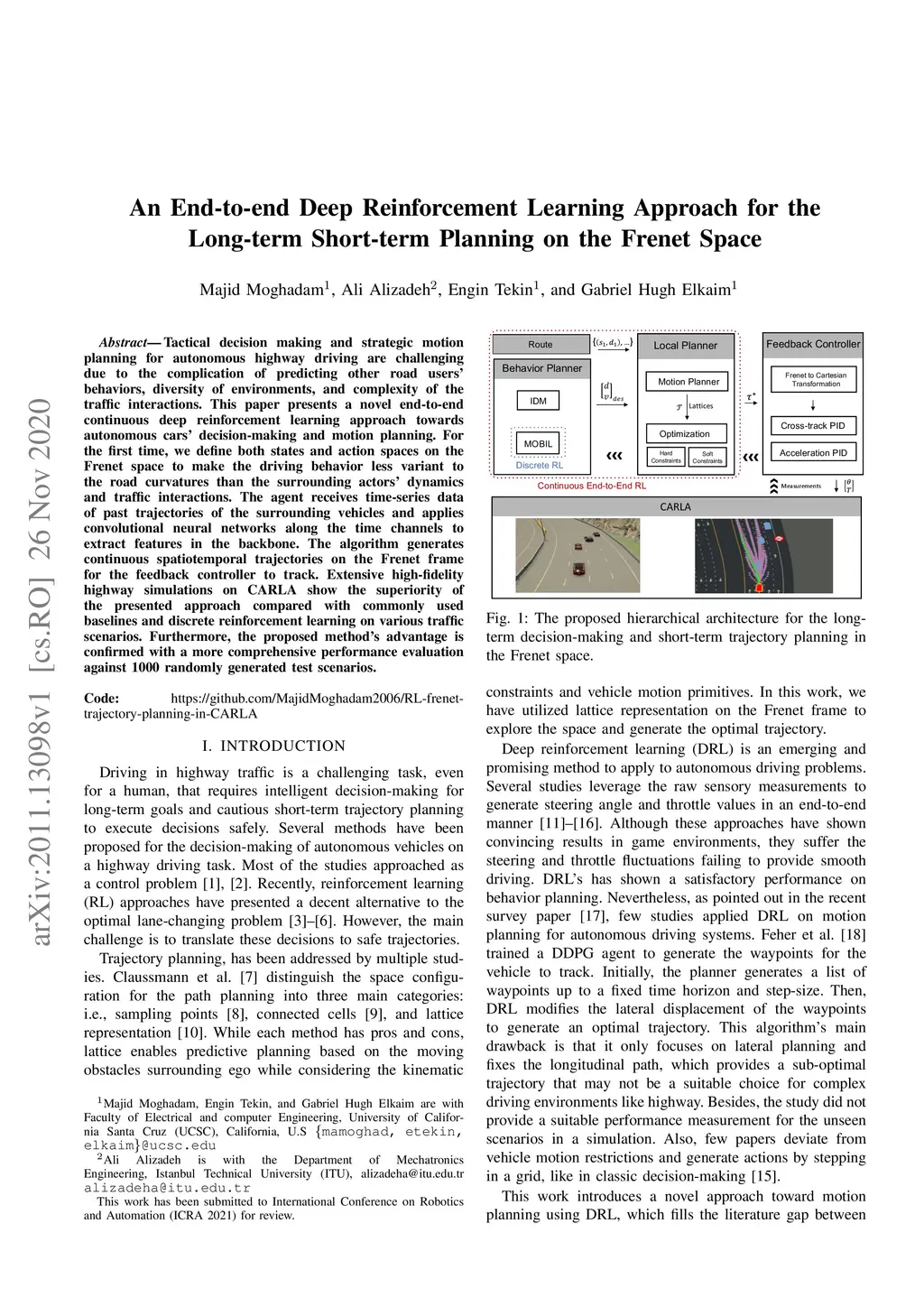 Tactical decision making and strategic motion planning for autonomous highway driving are challenging due to the complication of predicting other road users' behaviors, diversity of environments, and complexity of the traffic interactions. This paper presents a novel end-to-end continuous deep reinforcement learning approach towards autonomous cars' decision-making and motion planning. For the first time, we define both states and action spaces on the Frenet space to make the driving behavior less variant to the road curvatures than the surrounding actors' dynamics and traffic interactions. The agent receives time-series data of past trajectories of the surrounding vehicles and applies convolutional neural networks along the time channels to extract features in the backbone. The algorithm generates continuous spatiotemporal trajectories on the Frenet frame for the feedback controller to track. Extensive high-fidelity highway simulations on CARLA show the superiority of the presented approach compared with commonly used baselines and discrete reinforcement learning on various traffic scenarios. Furthermore, the proposed method's advantage is confirmed with a more comprehensive performance evaluation against 1000 randomly generated test scenarios.