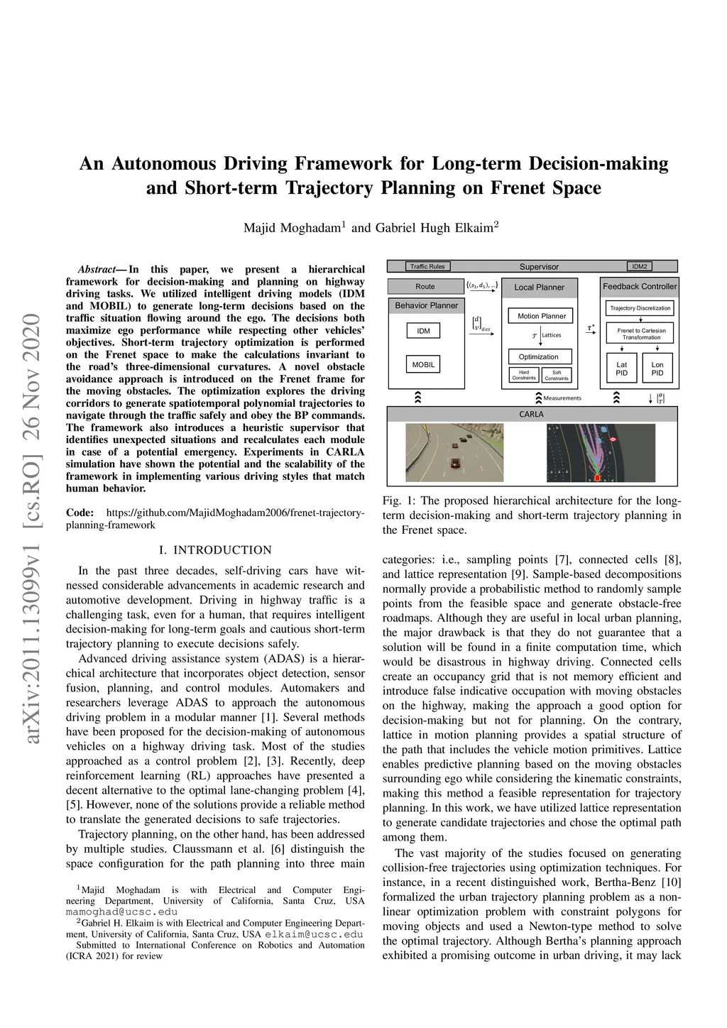 In this paper, we present a hierarchical framework for decision-making and planning on highway driving tasks. We utilized intelligent driving models (IDM and MOBIL) to generate long-term decisions based on the traffic situation flowing around the ego. The decisions both maximize ego performance while respecting other vehicles' objectives. Short-term trajectory optimization is performed on the Frenet space to make the calculations invariant to the road's three-dimensional curvatures. A novel obstacle avoidance approach is introduced on the Frenet frame for the moving obstacles. The optimization explores the driving corridors to generate spatiotemporal polynomial trajectories to navigate through the traffic safely and obey the BP commands. The framework also introduces a heuristic supervisor that identifies unexpected situations and recalculates each module in case of a potential emergency. Experiments in CARLA simulation have shown the potential and the scalability of the framework in implementing various driving styles that match human behavior.
