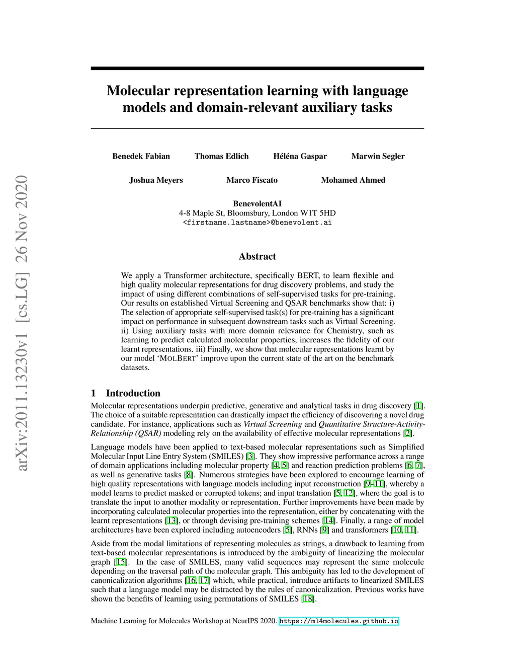 We apply a Transformer architecture, specifically BERT, to learn flexible and high quality molecular representations for drug discovery problems. We study the impact of using different combinations of self-supervised tasks for pre-training, and present our results for the established Virtual Screening and QSAR benchmarks. We show that: i) The selection of appropriate self-supervised task(s) for pre-training has a significant impact on performance in subsequent downstream tasks such as Virtual Screening. ii) Using auxiliary tasks with more domain relevance for Chemistry, such as learning to predict calculated molecular properties, increases the fidelity of our learnt representations. iii) Finally, we show that molecular representations learnt by our model `MolBert' improve upon the current state of the art on the benchmark datasets.