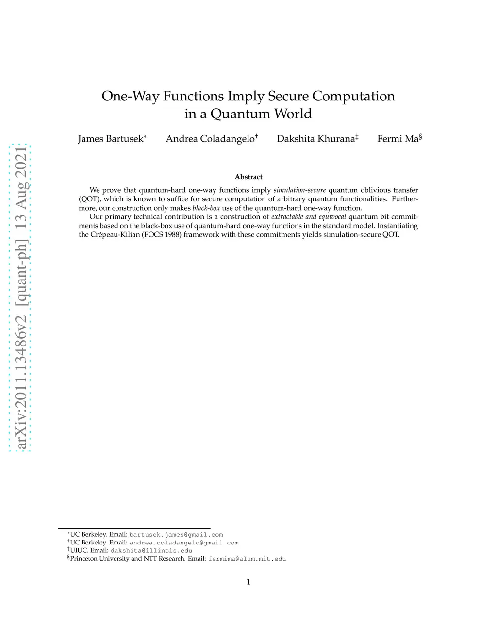 One-Way Functions Imply Secure Computation in a Quantum World