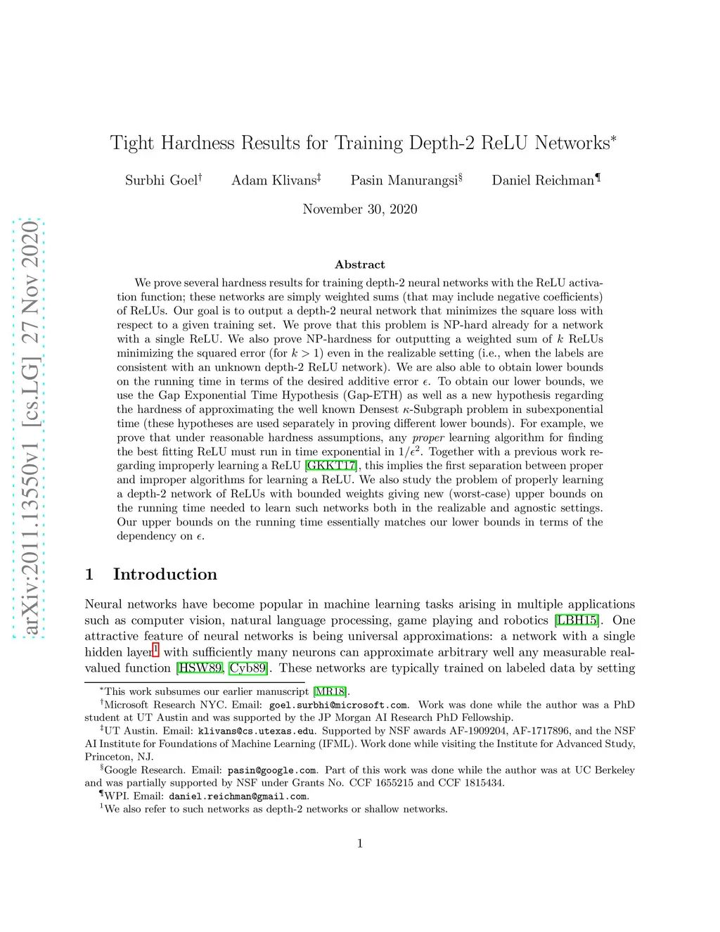 We prove several hardness results for training depth-2 neural networks with the ReLU activation function; these networks are simply weighted sums (that may include negative coefficients) of ReLUs. Our goal is to output a depth-2 neural network that minimizes the square loss with respect to a given training set. We prove that this problem is NP-hard already for a network with a single ReLU. We also prove NP-hardness for outputting a weighted sum of ReLUs minimizing the squared error (for ) even in the realizable setting (i.e., when the labels are consistent with an unknown depth-2 ReLU network). We are also able to obtain lower bounds on the running time in terms of the desired additive error . To obtain our lower bounds, we use the Gap Exponential Time Hypothesis (Gap-ETH) as well as a new hypothesis regarding the hardness of approximating the well known Densest -Subgraph problem in subexponential time (these hypotheses are used separately in proving different lower bounds). For example, we prove that under reasonable hardness assumptions, any proper learning algorithm for finding the best fitting ReLU must run in time exponential in . Together with a previous work regarding improperly learning a ReLU (Goel et al., COLT'17), this implies the first separation between proper and improper algorithms for learning a ReLU. We also study the problem of properly learning a depth-2 network of ReLUs with bounded weights giving new (worst-case) upper bounds on the running time needed to learn such networks both in the realizable and agnostic settings. Our upper bounds on the running time essentially matches our lower bounds in terms of the dependency on .