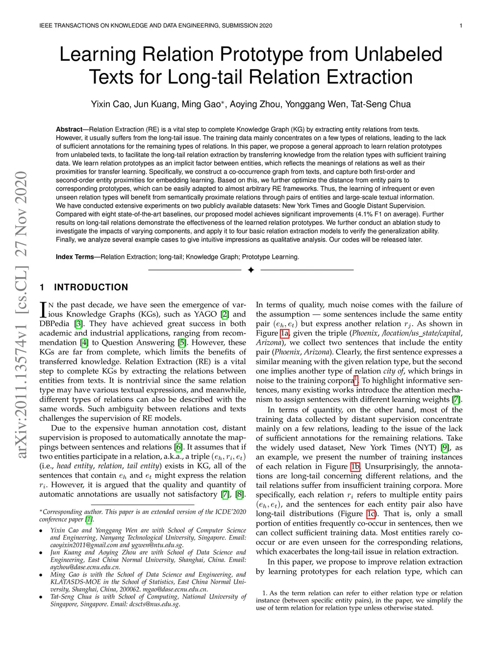 Relation Extraction (RE) is a vital step to complete Knowledge Graph (KG) by extracting entity relations from texts.However, it usually suffers from the long-tail issue. The training data mainly concentrates on a few types of relations, leading to the lackof sufficient annotations for the remaining types of relations. In this paper, we propose a general approach to learn relation prototypesfrom unlabeled texts, to facilitate the long-tail relation extraction by transferring knowledge from the relation types with sufficient trainingdata. We learn relation prototypes as an implicit factor between entities, which reflects the meanings of relations as well as theirproximities for transfer learning. Specifically, we construct a co-occurrence graph from texts, and capture both first-order andsecond-order entity proximities for embedding learning. Based on this, we further optimize the distance from entity pairs tocorresponding prototypes, which can be easily adapted to almost arbitrary RE frameworks. Thus, the learning of infrequent or evenunseen relation types will benefit from semantically proximate relations through pairs of entities and large-scale textual information.We have conducted extensive experiments on two publicly available datasets: New York Times and Google Distant Supervision.Compared with eight state-of-the-art baselines, our proposed model achieves significant improvements (4.1% F1 on average). Furtherresults on long-tail relations demonstrate the effectiveness of the learned relation prototypes. We further conduct an ablation study toinvestigate the impacts of varying components, and apply it to four basic relation extraction models to verify the generalization ability.Finally, we analyze several example cases to give intuitive impressions as qualitative analysis. Our codes will be released later.