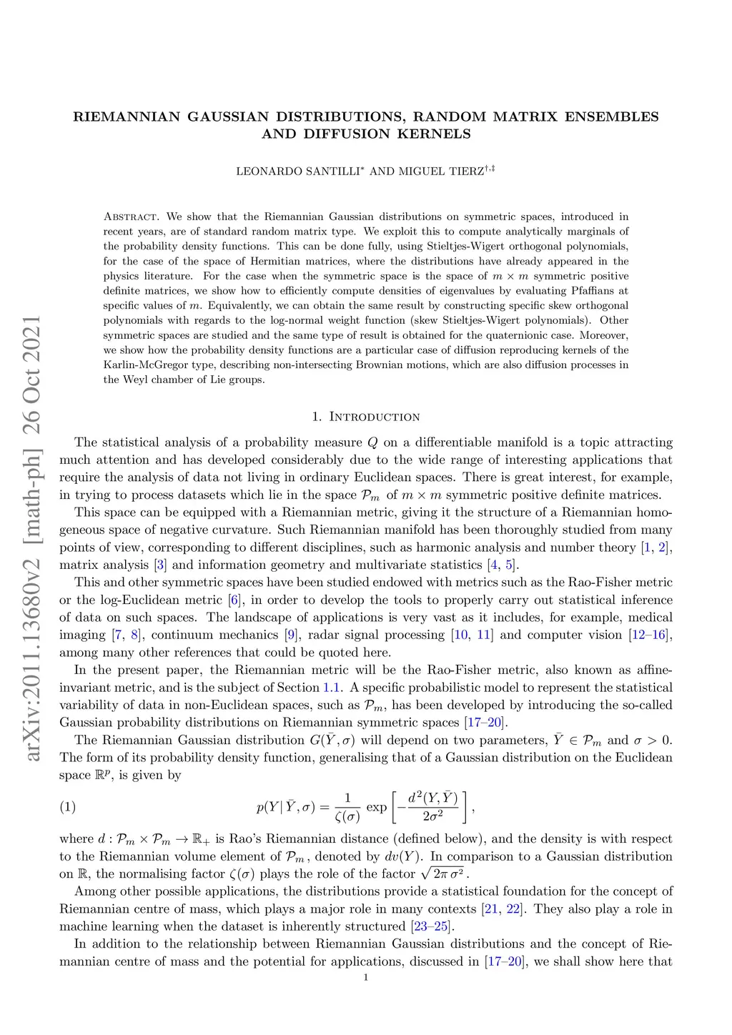 Riemannian Gaussian distributions, random matrix ensembles and diffusion
