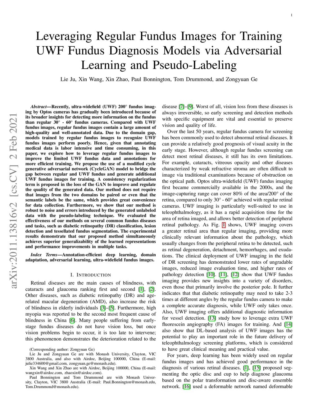 Recently, ultra-widefield (UWF) 200\degree~fundus imaging by Optos cameras has gradually been introduced because of its broader insights for detecting more information on the fundus than regular 30 degree - 60 degree fundus cameras. Compared with UWF fundus images, regular fundus images contain a large amount of high-quality and well-annotated data. Due to the domain gap, models trained by regular fundus images to recognize UWF fundus images perform poorly. Hence, given that annotating medical data is labor intensive and time consuming, in this paper, we explore how to leverage regular fundus images to improve the limited UWF fundus data and annotations for more efficient training. We propose the use of a modified cycle generative adversarial network (CycleGAN) model to bridge the gap between regular and UWF fundus and generate additional UWF fundus images for training. A consistency regularization term is proposed in the loss of the GAN to improve and regulate the quality of the generated data. Our method does not require that images from the two domains be paired or even that the semantic labels be the same, which provides great convenience for data collection. Furthermore, we show that our method is robust to noise and errors introduced by the generated unlabeled data with the pseudo-labeling technique. We evaluated the effectiveness of our methods on several common fundus diseases and tasks, such as diabetic retinopathy (DR) classification, lesion detection and tessellated fundus segmentation. The experimental results demonstrate that our proposed method simultaneously achieves superior generalizability of the learned representations and performance improvements in multiple tasks.