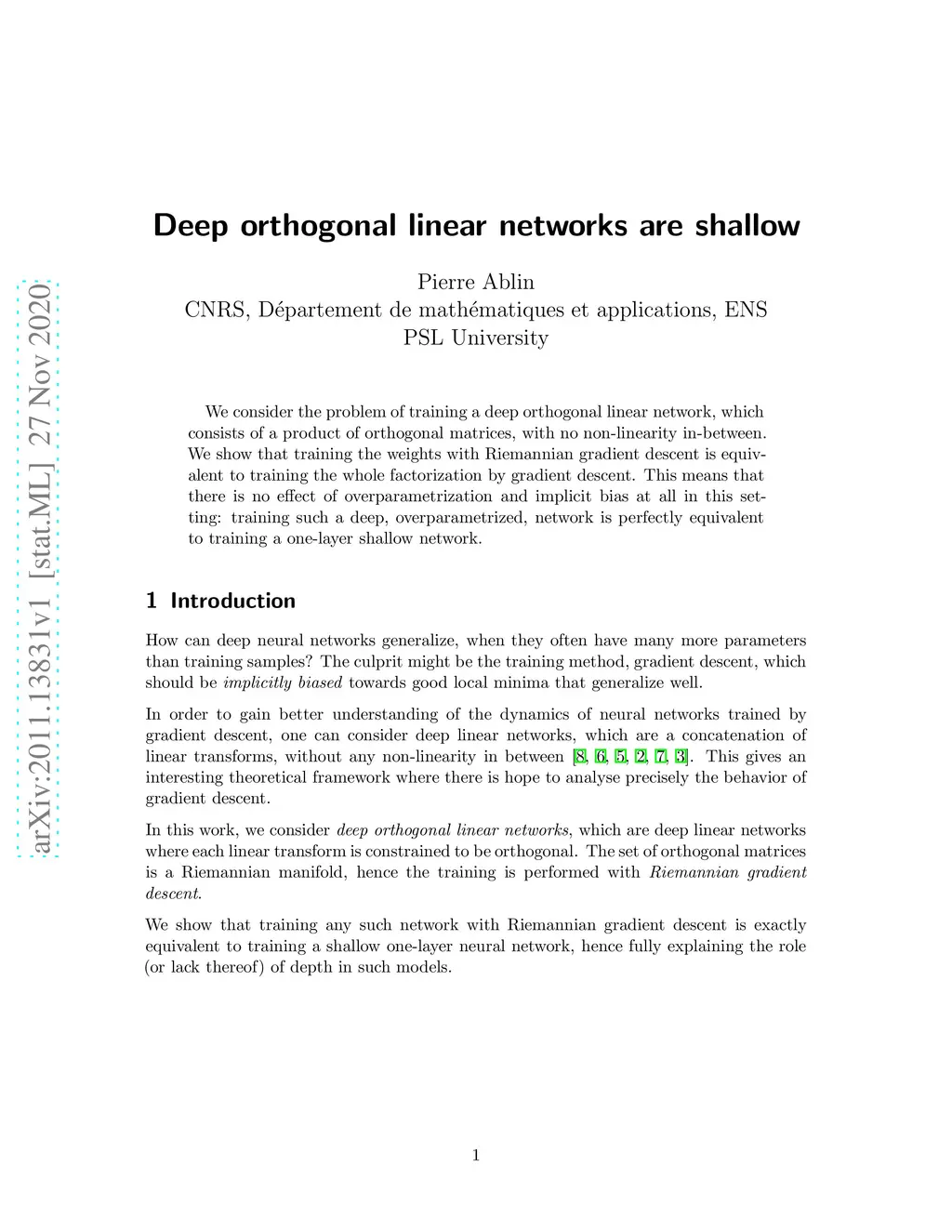 We consider the problem of training a deep orthogonal linear network, which consists of a product of orthogonal matrices, with no non-linearity in-between. We show that training the weights with Riemannian gradient descent is equivalent to training the whole factorization by gradient descent. This means that there is no effect of overparametrization and implicit bias at all in this setting: training such a deep, overparametrized, network is perfectly equivalent to training a one-layer shallow network.