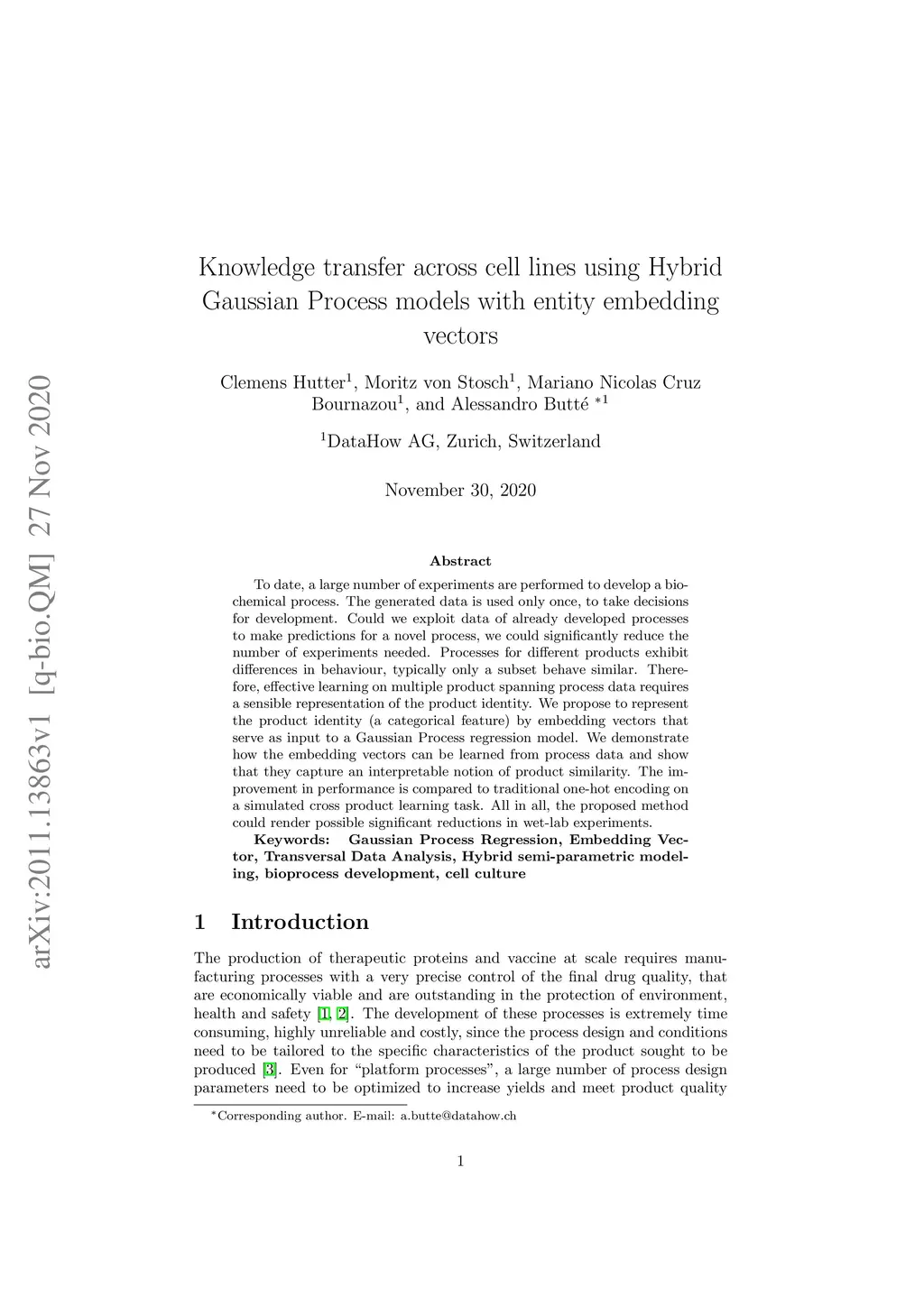 To date, a large number of experiments are performed to develop a biochemical process. The generated data is used only once, to take decisions for development. Could we exploit data of already developed processes to make predictions for a novel process, we could significantly reduce the number of experiments needed. Processes for different products exhibit differences in behaviour, typically only a subset behave similar. Therefore, effective learning on multiple product spanning process data requires a sensible representation of the product identity. We propose to represent the product identity (a categorical feature) by embedding vectors that serve as input to a Gaussian Process regression model. We demonstrate how the embedding vectors can be learned from process data and show that they capture an interpretable notion of product similarity. The improvement in performance is compared to traditional one-hot encoding on a simulated cross product learning task. All in all, the proposed method could render possible significant reductions in wet-lab experiments.