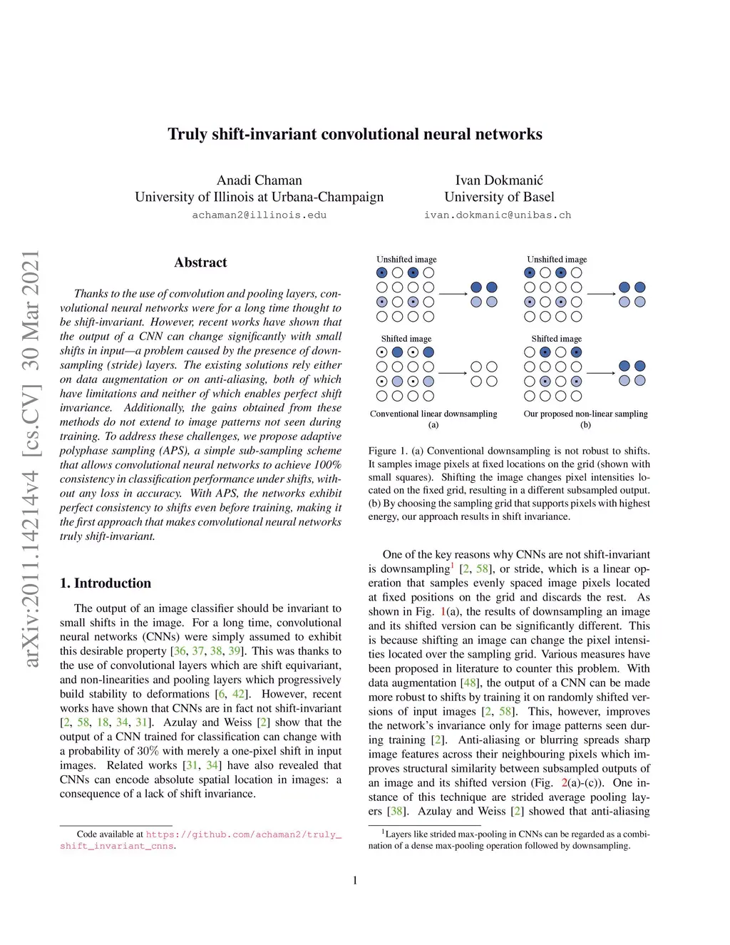 Thanks to the use of convolution and pooling layers, convolutional neural networks were for a long time thought to be shift-invariant. However, recent works have shown that the output of a CNN can change significantly with small shifts in input: a problem caused by the presence of downsampling (stride) layers. The existing solutions rely either on data augmentation or on anti-aliasing, both of which have limitations and neither of which enables perfect shift invariance. Additionally, the gains obtained from these methods do not extend to image patterns not seen during training. To address these challenges, we propose adaptive polyphase sampling (APS), a simple sub-sampling scheme that allows convolutional neural networks to achieve 100% consistency in classification performance under shifts, without any loss in accuracy. With APS, the networks exhibit perfect consistency to shifts even before training, making it the first approach that makes convolutional neural networks truly shift-invariant.