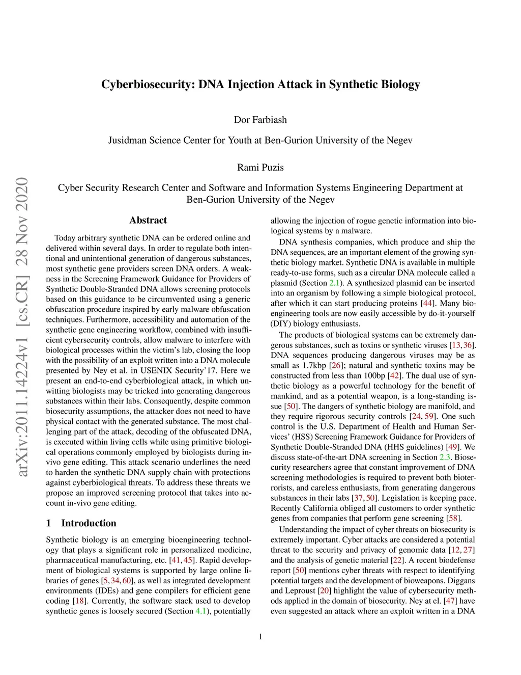 Today arbitrary synthetic DNA can be ordered online and delivered within several days. In order to regulate both intentional and unintentional generation of dangerous substances, most synthetic gene providers screen DNA orders. A weakness in the Screening Framework Guidance for Providers of Synthetic Double-Stranded DNA allows screening protocols based on this guidance to be circumvented using a generic obfuscation procedure inspired by early malware obfuscation techniques. Furthermore, accessibility and automation of the synthetic gene engineering workflow, combined with insufficient cybersecurity controls, allow malware to interfere with biological processes within the victim's lab, closing the loop with the possibility of an exploit written into a DNA molecule presented by Ney et al. in USENIX Security'17. Here we present an end-to-end cyberbiological attack, in which unwitting biologists may be tricked into generating dangerous substances within their labs. Consequently, despite common biosecurity assumptions, the attacker does not need to have physical contact with the generated substance. The most challenging part of the attack, decoding of the obfuscated DNA, is executed within living cells while using primitive biological operations commonly employed by biologists during in-vivo gene editing. This attack scenario underlines the need to harden the synthetic DNA supply chain with protections against cyberbiological threats. To address these threats we propose an improved screening protocol that takes into account in-vivo gene editing.