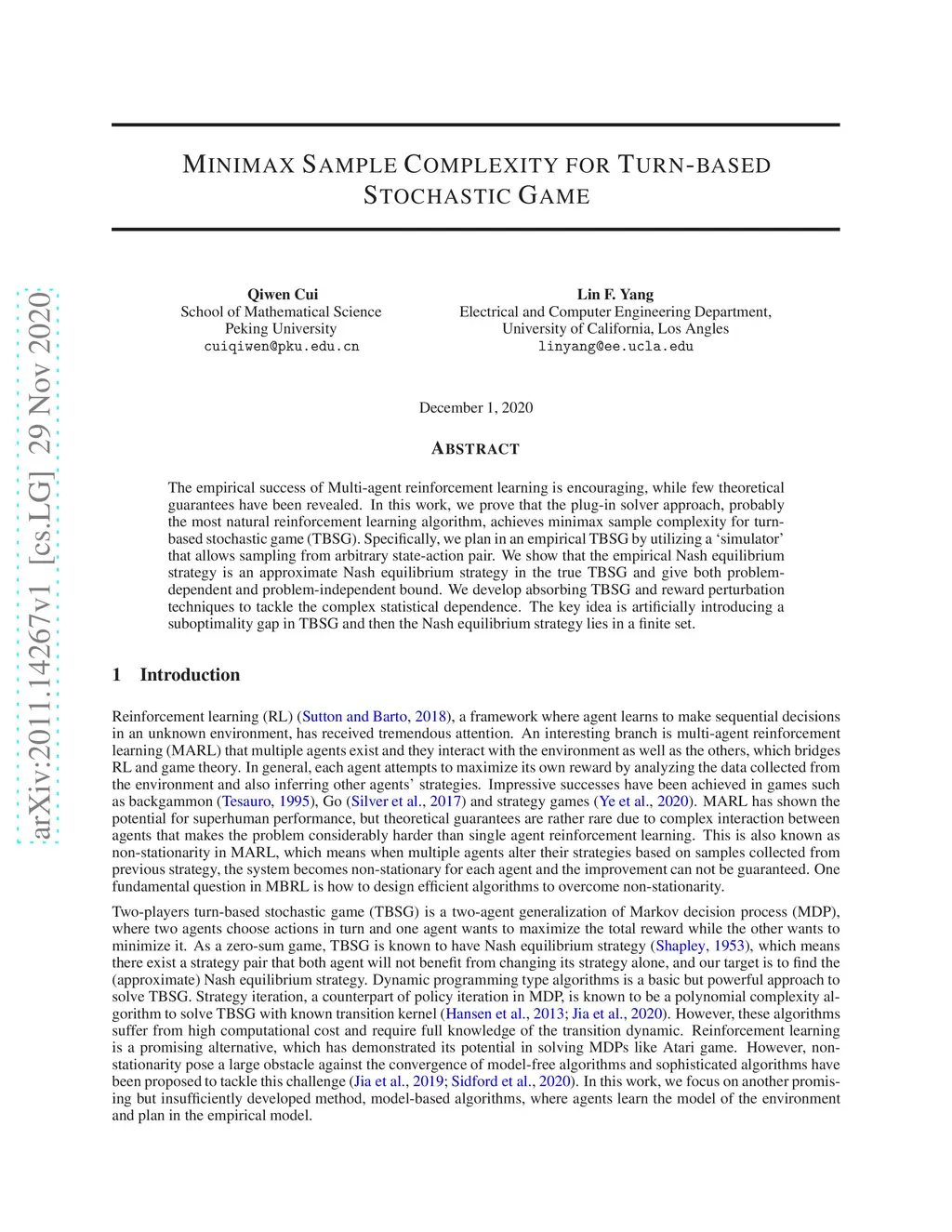 Minimax Sample Complexity for Turn-based Stochastic Game