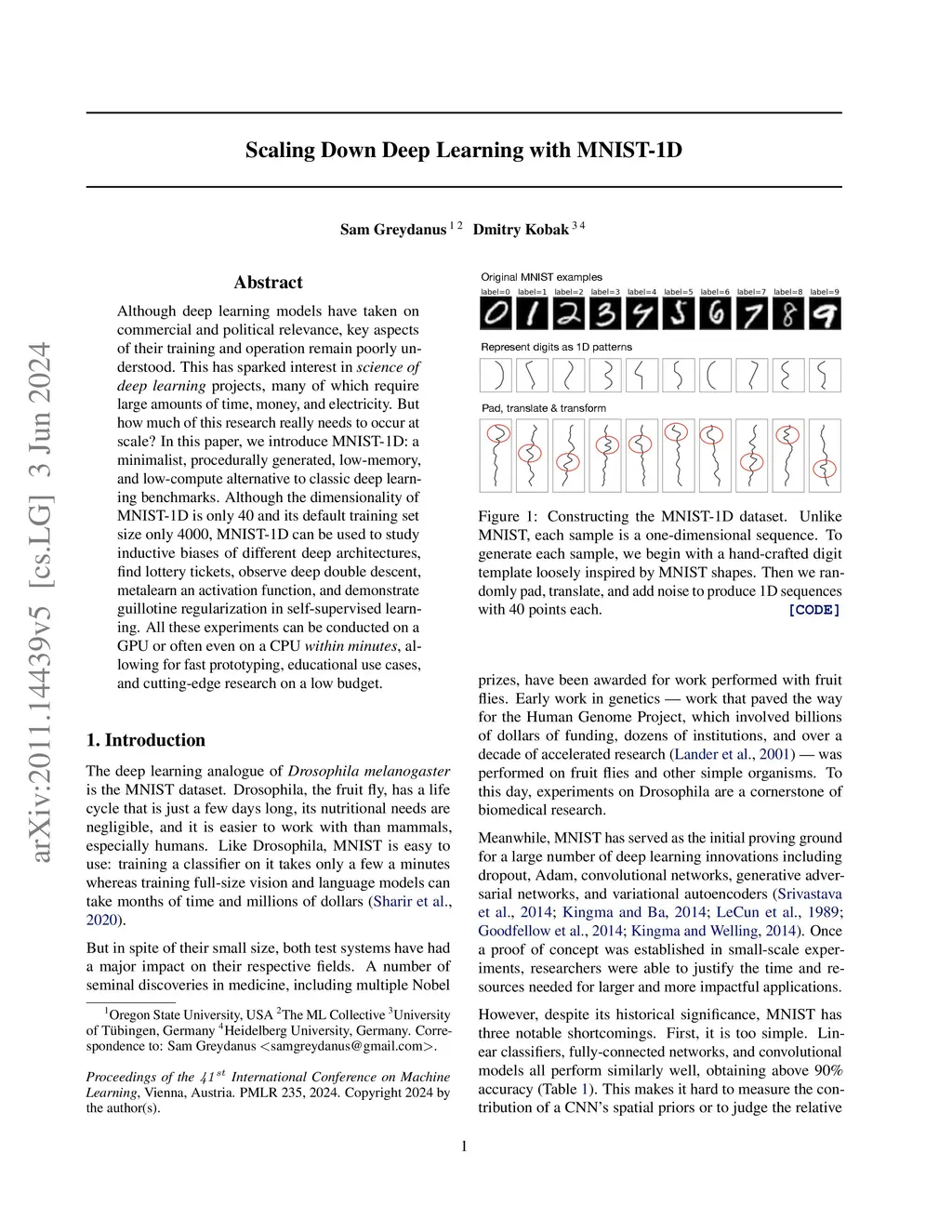 Although deep learning models have taken on commercial and political relevance, key aspects of their training and operation remain poorly understood. This has sparked interest in science of deep learning projects, many of which require large amounts of time, money, and electricity. But how much of this research really needs to occur at scale? In this paper, we introduce MNIST-1D: a minimalist, procedurally generated, low-memory, and low-compute alternative to classic deep learning benchmarks. Although the dimensionality of MNIST-1D is only 40 and its default training set size only 4000, MNIST-1D can be used to study inductive biases of different deep architectures, find lottery tickets, observe deep double descent, metalearn an activation function, and demonstrate guillotine regularization in self-supervised learning. All these experiments can be conducted on a GPU or often even on a CPU within minutes, allowing for fast prototyping, educational use cases, and cutting-edge research on a low budget.