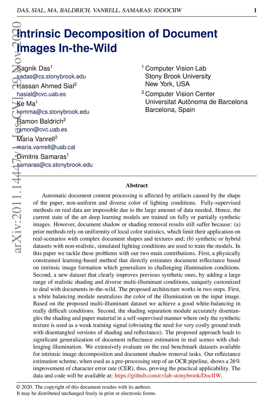 Automatic document content processing is affected by artifacts caused by the shape of the paper, non-uniform and diverse color of lighting conditions. Fully-supervised methods on real data are impossible due to the large amount of data needed. Hence, the current state of the art deep learning models are trained on fully or partially synthetic images. However, document shadow or shading removal results still suffer because: (a) prior methods rely on uniformity of local color statistics, which limit their application on real-scenarios with complex document shapes and textures and; (b) synthetic or hybrid datasets with non-realistic, simulated lighting conditions are used to train the models. In this paper we tackle these problems with our two main contributions. First, a physically constrained learning-based method that directly estimates document reflectance based on intrinsic image formation which generalizes to challenging illumination conditions. Second, a new dataset that clearly improves previous synthetic ones, by adding a large range of realistic shading and diverse multi-illuminant conditions, uniquely customized to deal with documents in-the-wild. The proposed architecture works in a self-supervised manner where only the synthetic texture is used as a weak training signal (obviating the need for very costly ground truth with disentangled versions of shading and reflectance). The proposed approach leads to a significant generalization of document reflectance estimation in real scenes with challenging illumination. We extensively evaluate on the real benchmark datasets available for intrinsic image decomposition and document shadow removal tasks. Our reflectance estimation scheme, when used as a pre-processing step of an OCR pipeline, shows a 26% improvement of character error rate (CER), thus, proving the practical applicability.