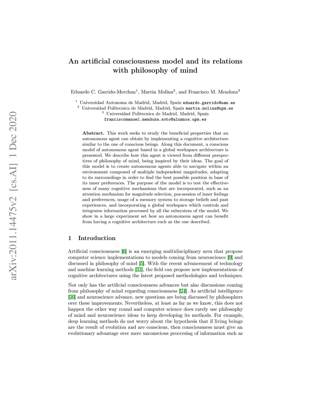 This work seeks to study the beneficial properties that an autonomous agent can obtain by implementing a cognitive architecture similar to the one of conscious beings. Along this document, a conscious model of autonomous agent based in a global workspace architecture is presented. We describe how this agent is viewed from different perspectives of philosophy of mind, being inspired by their ideas. The goal of this model is to create autonomous agents able to navigate within an environment composed of multiple independent magnitudes, adapting to its surroundings in order to find the best possible position in base of its inner preferences. The purpose of the model is to test the effectiveness of many cognitive mechanisms that are incorporated, such as an attention mechanism for magnitude selection, pos-session of inner feelings and preferences, usage of a memory system to storage beliefs and past experiences, and incorporating a global workspace which controls and integrates information processed by all the subsystem of the model. We show in a large experiment set how an autonomous agent can benefit from having a cognitive architecture such as the one described.
