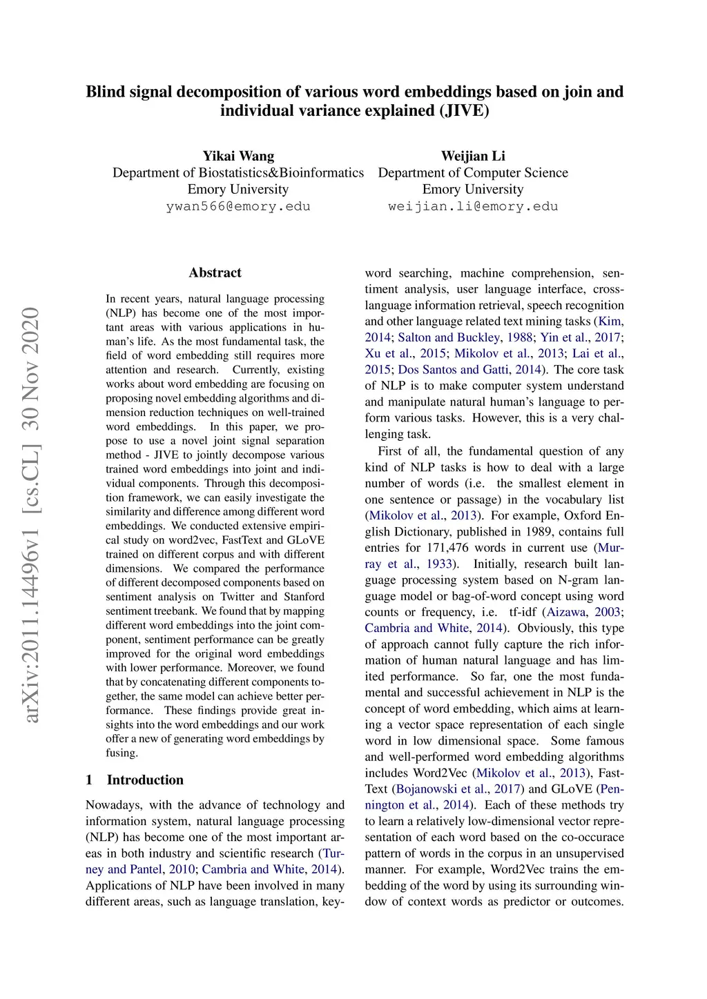 In recent years, natural language processing (NLP) has become one of the most important areas with various applications in human's life. As the most fundamental task, the field of word embedding still requires more attention and research. Currently, existing works about word embedding are focusing on proposing novel embedding algorithms and dimension reduction techniques on well-trained word embeddings. In this paper, we propose to use a novel joint signal separation method - JIVE to jointly decompose various trained word embeddings into joint and individual components. Through this decomposition framework, we can easily investigate the similarity and difference among different word embeddings. We conducted extensive empirical study on word2vec, FastText and GLoVE trained on different corpus and with different dimensions. We compared the performance of different decomposed components based on sentiment analysis on Twitter and Stanford sentiment treebank. We found that by mapping different word embeddings into the joint component, sentiment performance can be greatly improved for the original word embeddings with lower performance. Moreover, we found that by concatenating different components together, the same model can achieve better performance. These findings provide great insights into the word embeddings and our work offer a new of generating word embeddings by fusing.