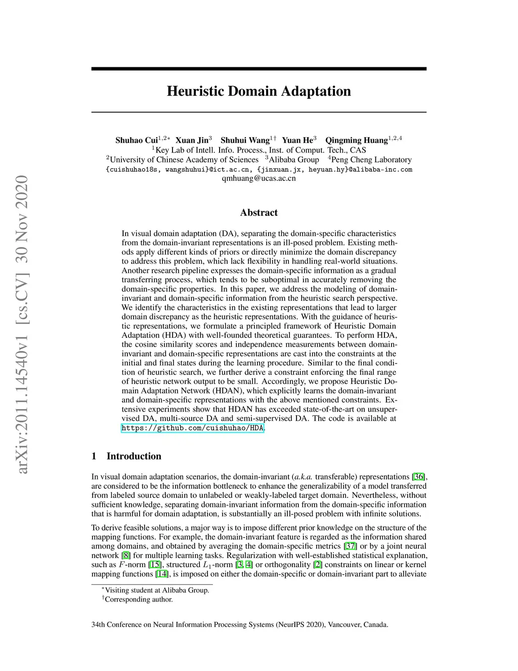 In visual domain adaptation (DA), separating the domain-specific characteristics from the domain-invariant representations is an ill-posed problem. Existing methods apply different kinds of priors or directly minimize the domain discrepancy to address this problem, which lack flexibility in handling real-world situations. Another research pipeline expresses the domain-specific information as a gradual transferring process, which tends to be suboptimal in accurately removing the domain-specific properties. In this paper, we address the modeling of domain-invariant and domain-specific information from the heuristic search perspective. We identify the characteristics in the existing representations that lead to larger domain discrepancy as the heuristic representations. With the guidance of heuristic representations, we formulate a principled framework of Heuristic Domain Adaptation (HDA) with well-founded theoretical guarantees. To perform HDA, the cosine similarity scores and independence measurements between domain-invariant and domain-specific representations are cast into the constraints at the initial and final states during the learning procedure. Similar to the final condition of heuristic search, we further derive a constraint enforcing the final range of heuristic network output to be small. Accordingly, we propose Heuristic Domain Adaptation Network (HDAN), which explicitly learns the domain-invariant and domain-specific representations with the above mentioned constraints. Extensive experiments show that HDAN has exceeded state-of-the-art on unsupervised DA, multi-source DA and semi-supervised DA. The code is available at https://github.com/cuishuhao/HDA.