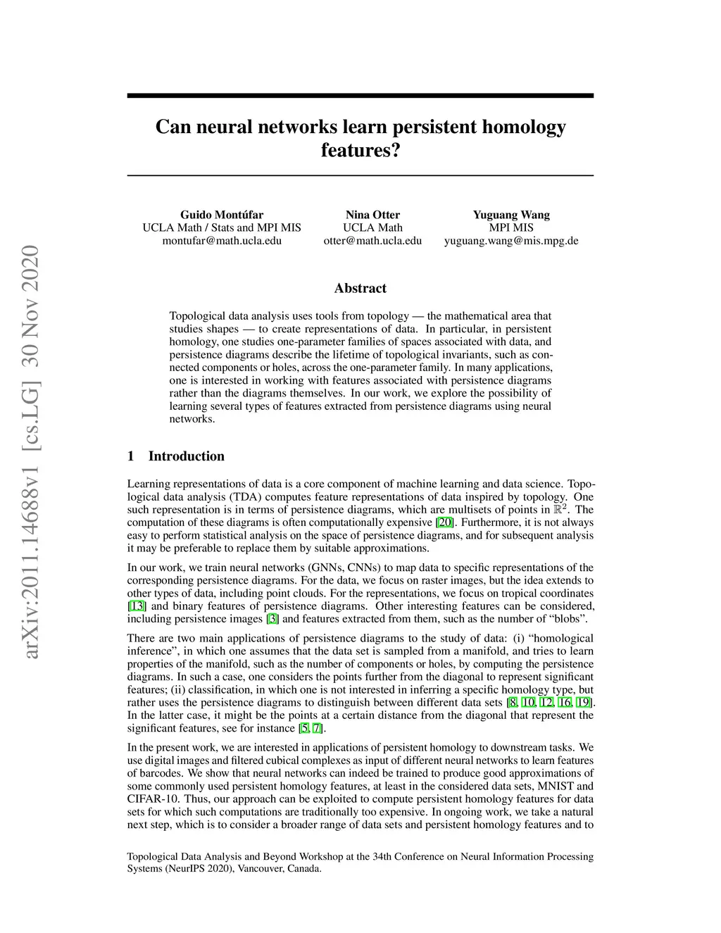 Topological data analysis uses tools from topology -- the mathematical area that studies shapes -- to create representations of data. In particular, in persistent homology, one studies one-parameter families of spaces associated with data, and persistence diagrams describe the lifetime of topological invariants, such as connected components or holes, across the one-parameter family. In many applications, one is interested in working with features associated with persistence diagrams rather than the diagrams themselves. In our work, we explore the possibility of learning several types of features extracted from persistence diagrams using neural networks.