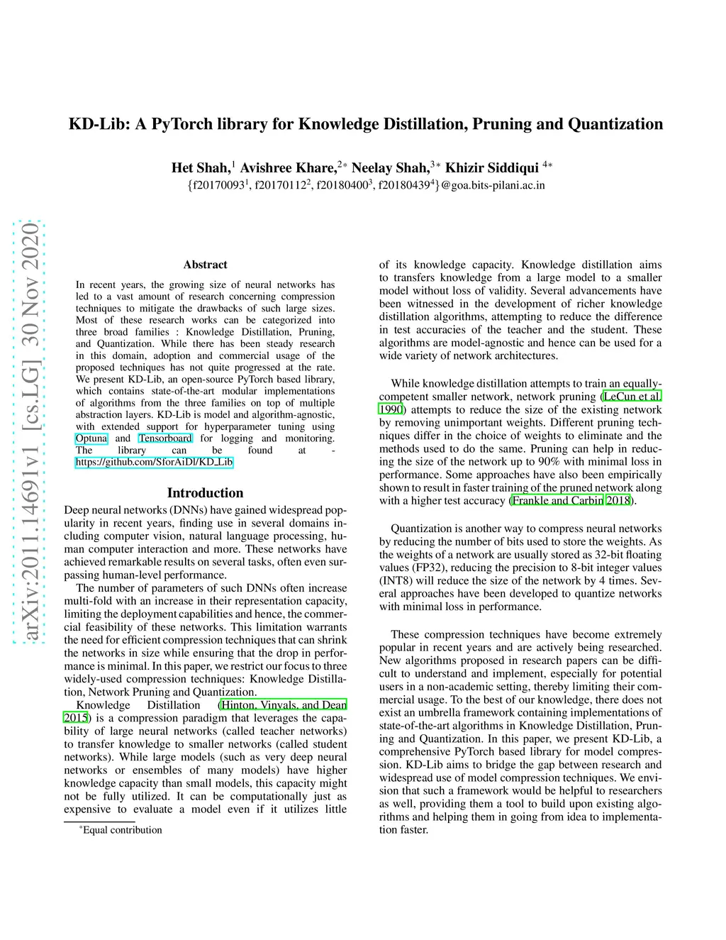 In recent years, the growing size of neural networks has led to a vast amount of research concerning compression techniques to mitigate the drawbacks of such large sizes. Most of these research works can be categorized into three broad families : Knowledge Distillation, Pruning, and Quantization. While there has been steady research in this domain, adoption and commercial usage of the proposed techniques has not quite progressed at the rate. We present KD-Lib, an open-source PyTorch based library, which contains state-of-the-art modular implementations of algorithms from the three families on top of multiple abstraction layers. KD-Lib is model and algorithm-agnostic, with extended support for hyperparameter tuning using Optuna and Tensorboard for logging and monitoring. The library can be found at - https://github.com/SforAiDl/KD_Lib.