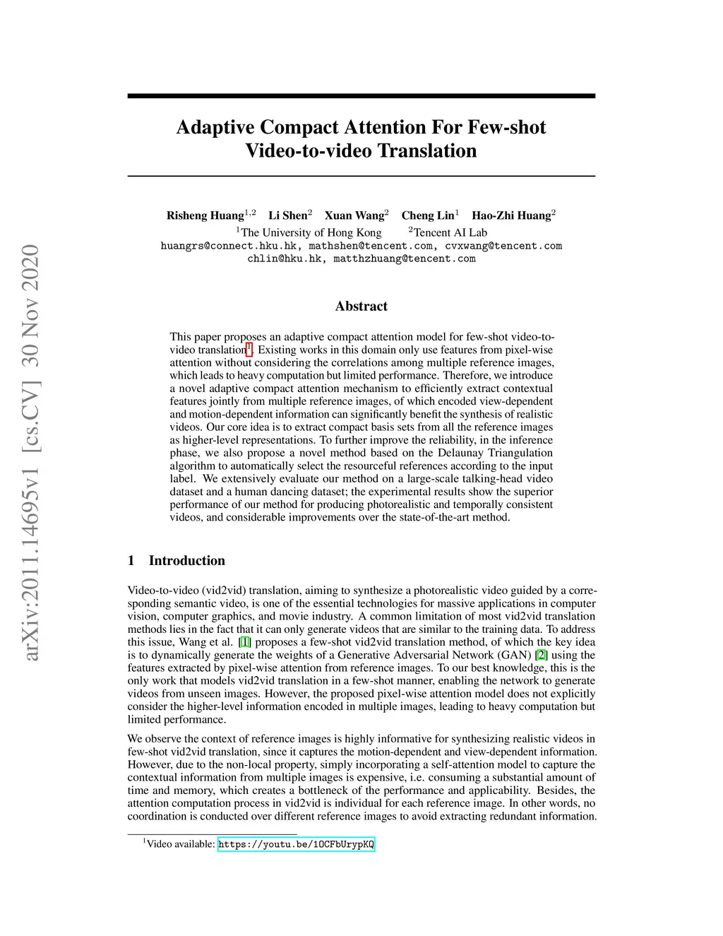Adaptive Compact Attention For Few-shot Video-to-video Translation