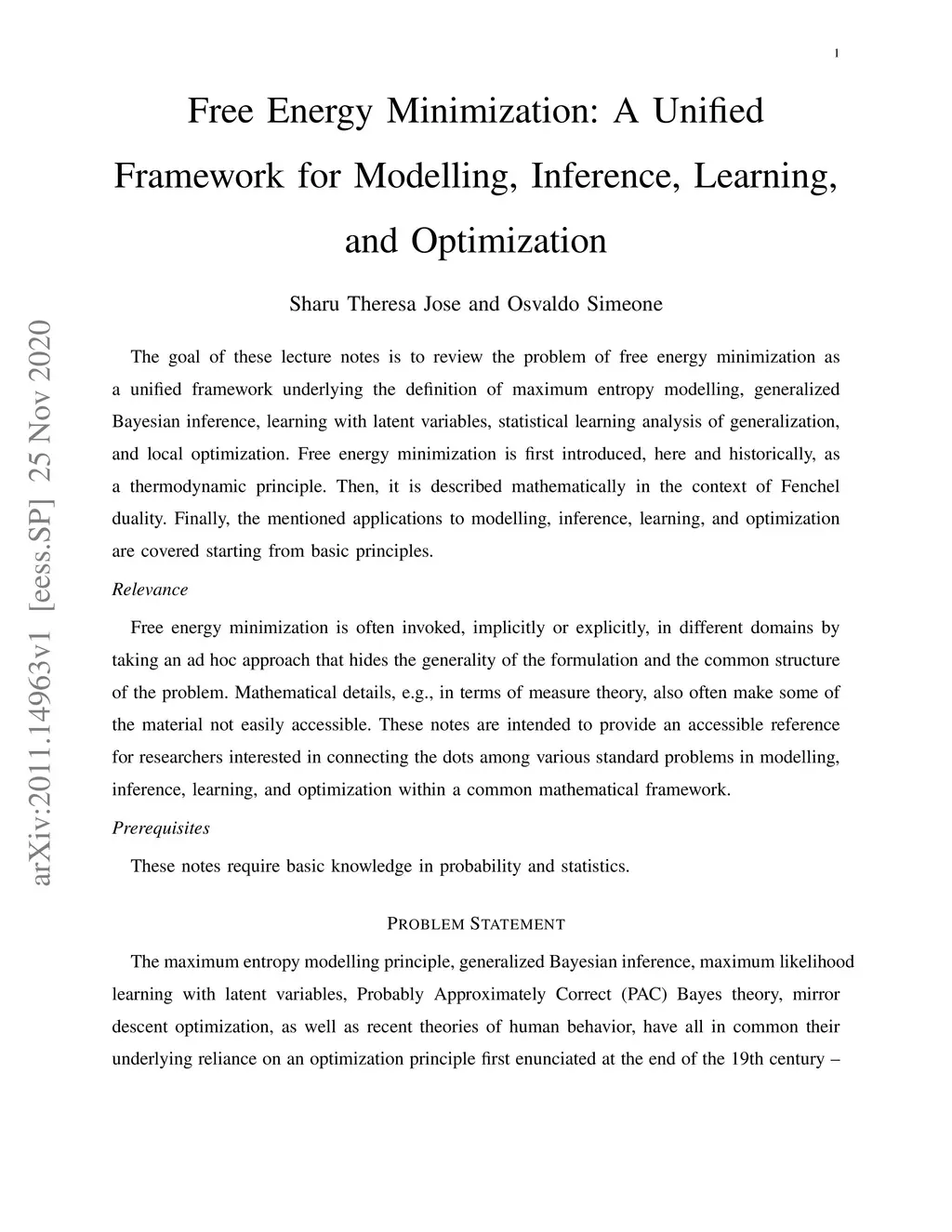The goal of these lecture notes is to review the problem of free energy minimization as a unified framework underlying the definition of maximum entropy modelling, generalized Bayesian inference, learning with latent variables, statistical learning analysis of generalization,and local optimization. Free energy minimization is first introduced, here and historically, as a thermodynamic principle. Then, it is described mathematically in the context of Fenchel duality. Finally, the mentioned applications to modelling, inference, learning, and optimization are covered starting from basic principles.