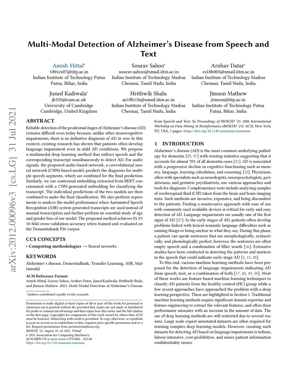 Multi-Modal Detection of Alzheimer's Disease from Speech and Text