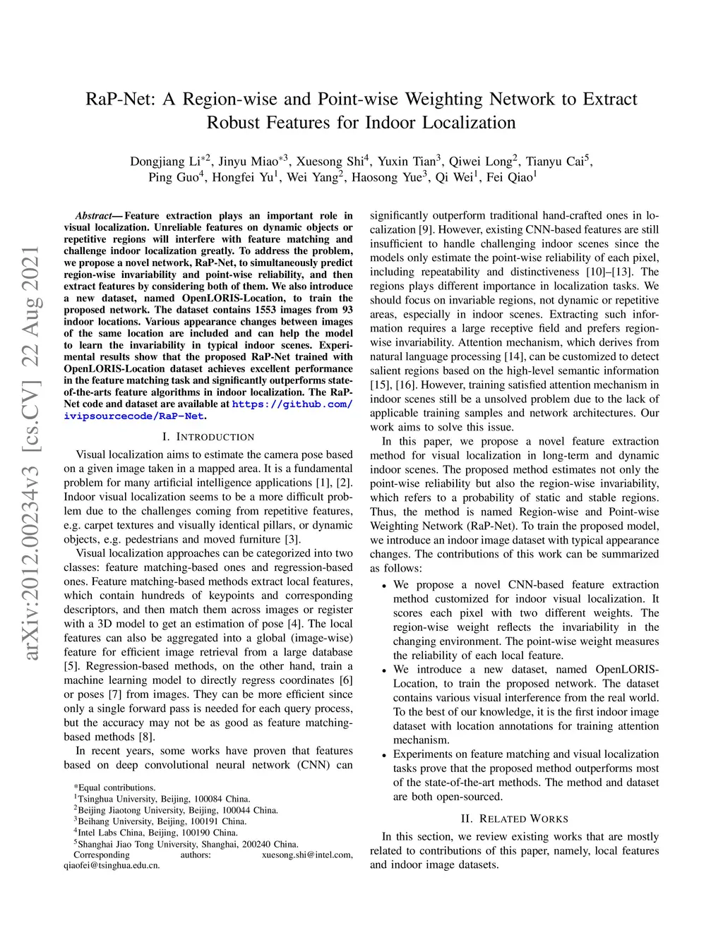 Feature extraction plays an important role in visual localization. Unreliable features on dynamic objects or repetitive regions will interfere with feature matching and challenge indoor localization greatly. To address the problem, we propose a novel network, RaP-Net, to simultaneously predict region-wise invariability and point-wise reliability, and then extract features by considering both of them. We also introduce a new dataset, named OpenLORIS-Location, to train the proposed network. The dataset contains 1553 images from 93 indoor locations. Various appearance changes between images of the same location are included and can help the model to learn the invariability in typical indoor scenes. Experimental results show that the proposed RaP-Net trained with OpenLORIS-Location dataset achieves excellent performance in the feature matching task and significantly outperforms state-of-the-arts feature algorithms in indoor localization. The RaP-Net code and dataset are available at https://github.com/ivipsourcecode/RaP-Net.